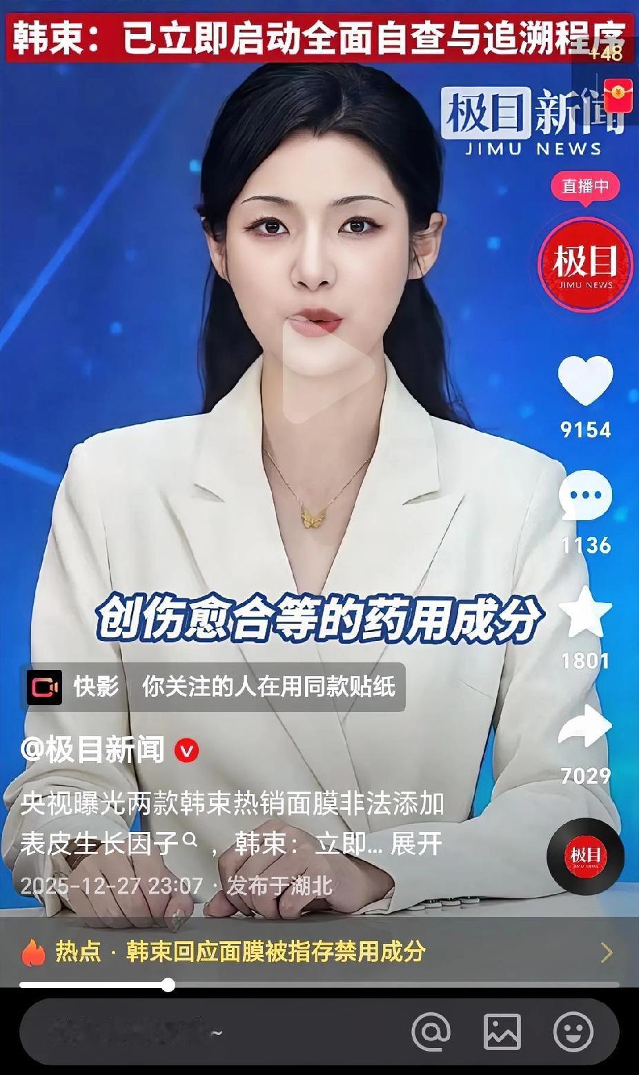 韩束面膜上了央视新闻! 有买过韩束面膜的网友害怕了,说:我刚买了 面膜里面居然非法添加“表皮生长因子” , 有人使用含此成分护肤品后,面部皮肤僵硬、皮下软组织增厚约1cm! 有人说:这是治伤口的,没有伤口,乱用就会表皮增厚! 你们用什么牌子化妆品?哪个牌子可靠?我认为最好不用化妆品,有的人不用化妆品皮肤超好。