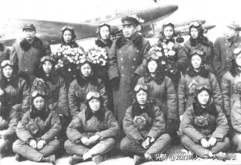 1952年3月8日,刘亚楼(后排左一)、肖华(后排右一)陪同朱德(后排右四)在北京西郊机场接见参加飞行表演的新中国第一批女航空人员。
