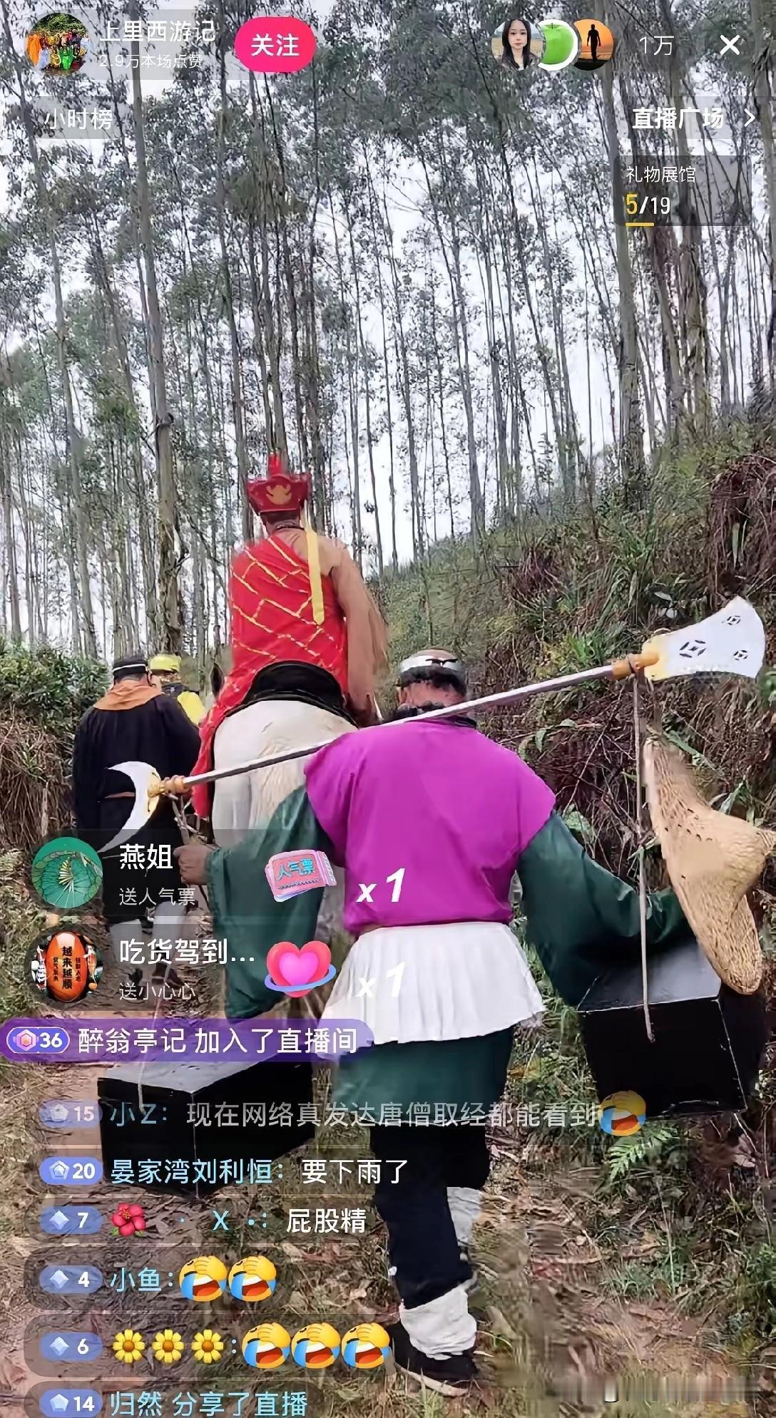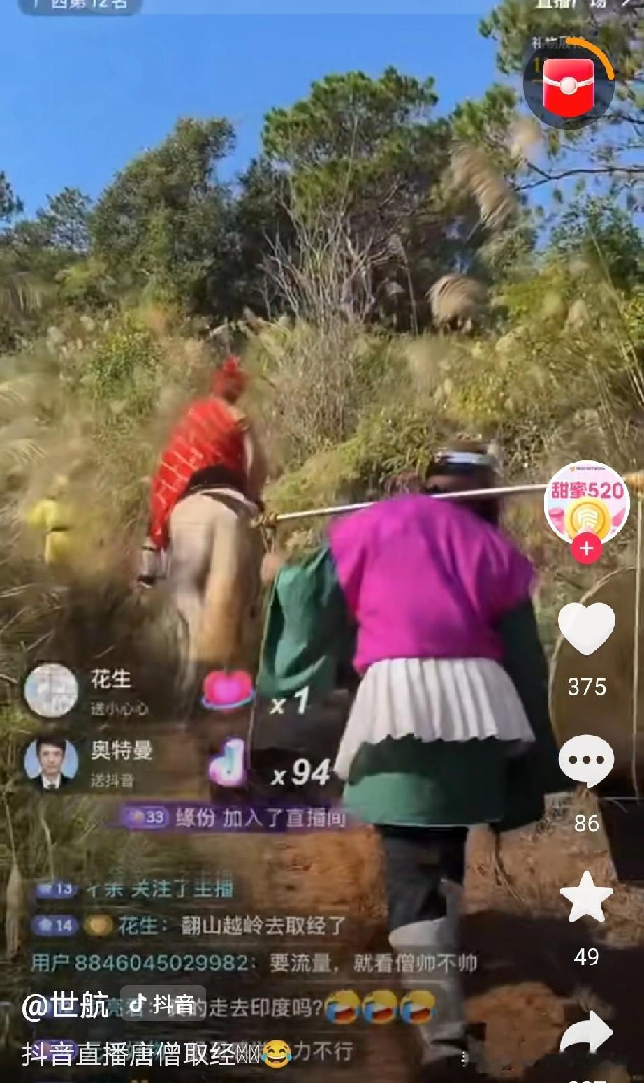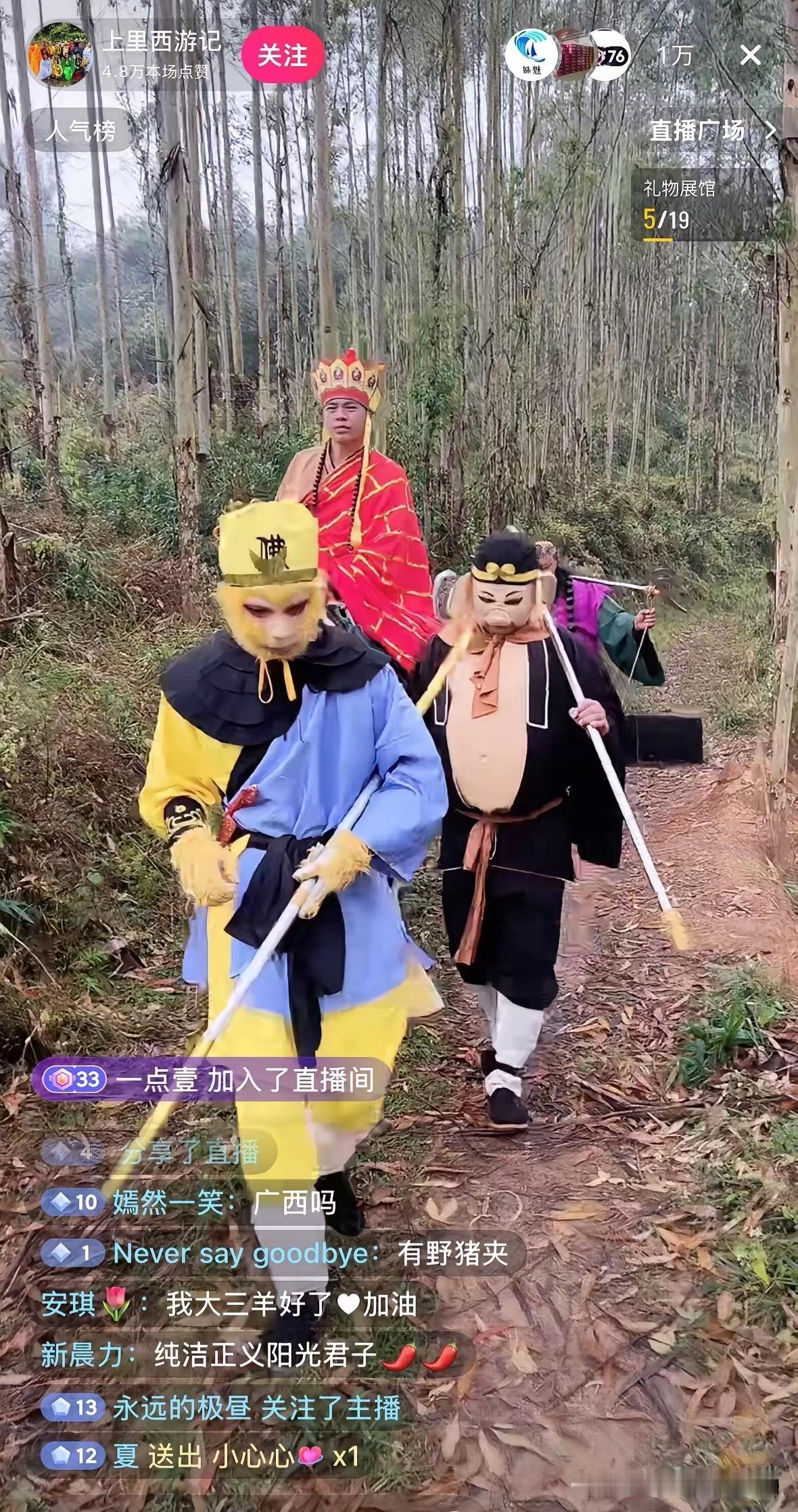 《西游记》真人版直播,单场打赏突破50万,这战绩在直播界都是天花板了,当直播已经没有赛道了,没想到“师徒四人”的重走西天让他们杀出一条血路,日入过万,直播效果拉满,短短几天直播间涨粉几十万。 其实他们的剧本很简单,​找四个演员,分别扮演孙悟空、猪八戒、沙和尚以及唐僧,另外还需要一匹白马,再找几个人扮演妖精,菩萨,然后去走一些实实在在的山路,主播自己跟在后面解说,轻松轻松几万人在线看,礼物收到手软。 粉丝打赏火箭,唐僧就骑马多走十里;嘉年华刷屏,悟空立刻横扫妖怪,但是这样的直播很有趣,比起刷礼物就敲锣放烟花和推到砖块这些来,这样的真人西游记直播真的太吸引人了,才开始直播直播间人数就从个位数冲到15万,单场打赏破了50万。 有网友质疑,他们这样靠直播打赏化缘,能不能走到印度取到真经,大家不用担心,他们走不出广西,就已经赚的盆满体钵了,哪里还需要真的走去印度取经。对他们而言,能不能取经已经不重要的,重要的是把剧本一直演下去,吸引粉丝赚取流量和银子。 还有网友猜测,四个人会不会因为直播打赏分配不均产生分歧,脑洞大开的网友已经帮他们分配好了,唐僧5%,白龙马10%,孙猴子15%,猪八戒20%,沙僧50%。因为唐僧虽然是师傅,但是他骑马行走一点都不辛苦,应该是分配钱最少的。 沙僧挑的担子最重,他应该分到的最多,其次是猪八戒,他负责牵马也辛苦,孙悟空虽然负责打妖怪,但是分的不多,因为他最轻松,在前面甩一下金箍棍就是了,所以大师兄的他也就分的少一些。还有网友说白龙马很辛苦,希望赚到钱不要亏待它,多给它喂点口粮。 直播间很热闹,评论的人很多,有网友问需不需要演员来演妖精,我可以扮演妖精拦路抢劫,这样剧情更真实些。好多网友问要不要到女儿国了, 看来女儿国这段是他们最期待的剧情。有网友猜测沙和尚担子里面挑的肯定是方便面矿泉水,评论区各种想法都有。 作为四大名著之一的《西游记》毕竟是大家都熟悉的剧情,以这样的形式直播,肯定很吃香,我在想接下来会不会有人直播《水浒传》、《三国演义》、《红楼梦》之类的剧情,毕竟四大名著都深入人心,随便直播一部都会有刷不完的流量。