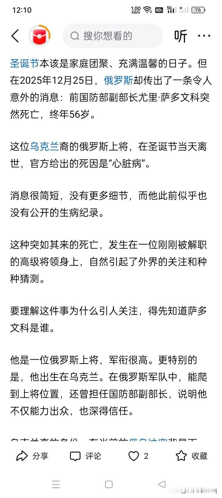 壮年突亡? 一个国家相当高级的官员,在56岁这个年龄,差不多应该是正值壮年,正是为国家服务和做出贡献的大好年华。然而,12月25日,也可能是西方国家最盛大的节日——圣诞节的这天,俄罗斯前国防部副部长尤里·萨多文科就死亡了,在56岁这个年龄的时候划上了句号。 据俄罗斯方面的消息,萨多文科死于突然发生的心脏病。关于萨多文科的情况大致是这样,他是俄罗斯前国防部副部长兼国防部参谋长,上将军衔,似乎与前国防部长绍伊古关系密切。但他出生于乌克兰,就像乌克兰军队总司令西尔斯基出生于俄罗斯一样的情况。好像在去年5月的时候,萨多文科在外界不明原因的情况下,也是在突然之间被解除国防部副部长和国防部参谋长一职。 萨多文科的死亡并不稀奇,因为自从俄罗斯在2022年2月24日对乌克兰采取的特别军事行动至今,俄罗斯已经有相当数量的高官重臣,富商大咖命归黄泉。那么,萨多文科的死亡,是否与目前的乌克兰战争有关呢?间接的关系估计一定存在,是否有直接关系,无从得知。其实,俄罗斯死的高官富商中,似乎并缺少扑朔迷离的情况。