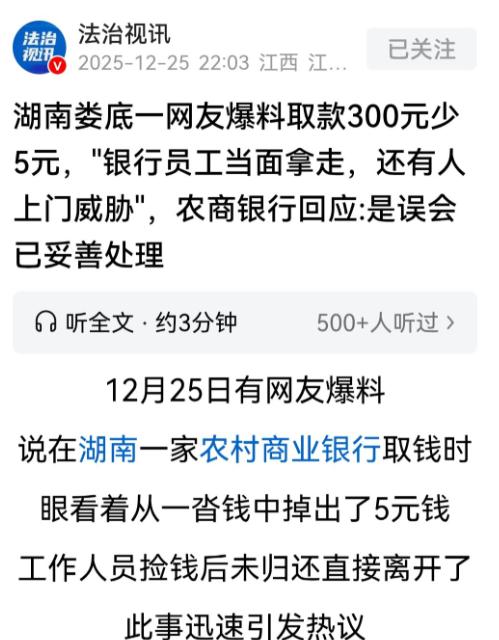 湖南娄底,女子去银行取300块钱,点钞机点了几遍都是60张。可就在柜员把钱递给她时,眼看着柜员手中的一沓钱掉出一张,女子要求柜员归还,而柜员却让她再数一遍,自己起身离开了岗位。女子数完钱正好少一张,她向另外两名工作人员说明情况,两人就和她吵架。女子拍下视频发到网上,没想到,当天有人打电话威胁她,还带了十几个人去敲她家的门,女子吓得浑身发抖现场报警,而结局令人意外。 12月15日,在冷水江市的一家银行网点,一位女客户因为家中有事,特意去柜台取300元现金,并且明确要求全部要5元面额的新钞。 对于柜员来说,数钞是基本功。点钞机运转了数次,屏幕上那一串数字“60”红得刺眼,没有任何异议——60张5元,正好300元。如果不出现意外,这一沓钱递到窗口外,业务就算结束了。 但怪事就在交接的瞬间发生了。眼尖的客户明明看到一张纸币从那一沓钱里滑落,不偏不倚正好掉在了柜台内的计算器旁边。 然而坐在里面的柜员似乎有着一套完全不同的逻辑。她并没有把这张钱捡起来还给客户,而是当着客户的面,先把这张掉落的5元纸币捡起来,反手放进了自己的抽屉里,然后才把剩下的一沓钱递了出来。 这一套行云流水的操作把窗外的女子看懵了。按理说,点钞机既然已经确认了总数,那么这一把钱此刻的所有权在法理上已经完成了让渡,掉在地上的就是客户的钱。 根据《民法典》对于拾得遗失物的规定,归还是天经地义的义务,更何况这是就在眼皮底下的“克扣”。 女子当场急了,质问对方为何要把那一张钱收起来:“我刚看到掉一张在计算器那里了,你只给我295元,为什么要放进抽屉?” 面对质问,这名柜员展现出的既不是职业素养,也不是心虚,而是一种令人窒息的傲慢。她只冷冷地抛下一句:“你再数一遍吧”,随后竟然直接起身离开了工位,把客户晾在原地。 柜员这一走,局面瞬间变得被动。如果此时客户拿了钱离开,出了这道门再回来找,那就是跳进黄河也洗不清。为了自证清白,女子只能强压着怒火,在摄像头和其他工作人员的注视下,把自己手里的钱一张张摊开来数。 结果毫无悬念,59张,正好295元,这时候原本应该来解决问题的银行其他两名工作人员凑了过来。按常理,同事离岗、账目不清,内部核查一下监控或者那个抽屉就能解决。 但这两位的屁股明显歪了,不仅没有协助核实,反而开始为同事帮腔,甚至用“她可能以为是自己的”这种荒唐理由来搪塞,随后演变成了激烈的争吵。 在这样一个封闭的环境里,面对这一排“统一战线”的工作人员,女子感受到的不仅仅是少那5块钱的损失,更是一种孤立无援的羞辱。被逼无奈之下,她掏出手机记录下了现场的乱象,并把这段并不愉快的经历发到了网上。 这原本只是消费者维权的无奈之举,毕竟现在遇事拍个视频留证已经是大家的共识。但谁也没想到,这个视频不仅没有等来银行的道歉,反而引来了一场噩梦。 就在视频发布当天的晚上,女子的手机突然响起。电话那头,一名男子语气凶狠,还没等女子反应过来,一通带着恐吓意味的警告就砸了过来,对方甚至嚣张地宣称已经摸清了她的家庭住址。 如果说电话里的威胁还能勉强自我安慰是恶作剧,那么接下来发生的一幕,足以让任何一个独居女性魂飞魄散。 深夜的楼道里响起了嘈杂的脚步声,紧接着就是剧烈的敲门声。女子战战兢兢地通过猫眼往外一看,心脏差点跳出嗓子眼——狭窄的楼道里竟然挤满了人,黑压压一片,粗略估计有十几个人。这哪里是来沟通的,分明就是以前港片里才有的“扫楼”架势。 为首的男子正是那个打电话的人,他的真实身份在警方到来后才被揭开——白天那个涉事柜员的丈夫。 为了那所谓的“老婆受了委屈”,这个男人纠集了一帮亲朋好友,利用银行系统内某种不可言说的渠道获取了客户的家庭住址,搞出了这场性质极其恶劣的“私刑报复”。 这种行为,其实已经触碰了《治安管理处罚法》中关于“写恐吓信或者以其他方法威胁他人人身安全”的红线,甚至还构成了干扰他人正常生活。 一个普通储户,白天在银行被克扣了钱财,受了气,晚上还要被掌握着自己详细信息的银行职员家属带人堵门。这种安全感的全面崩塌,比那丢失的5元钱要严重千万倍。 面对这种赤裸裸的人身威胁,女子吓得浑身发抖,第一时间拨打了110。警方的介入终于让这群失去理智的人冷静了下来。 最后的处理结果虽然说是“圆满和解”,但读起来总让人觉得心里堵得慌。在派出所里,那个行长终于出现了,解释说自己白天因公外出没能及时处理;那个离岗的柜员也道歉了,承认自己不该那种态度;带人堵门的老公也低头认错了,说是自己一时冲动。
