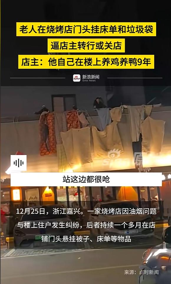 “这老人太可怕!”近日,浙江嘉兴,一男子开了家烧烤店,因油烟噪音问题,与楼上居住的老人发生争执,为逼男子关店,老人连续一个月在店门口挂床单倒垃圾,还不允许顾客大声说话,严重影响了男子的生意。网友:根本惹不起! 本来想高高兴兴去撸个串,结果头上挂着“招魂幡”似的床单被褥,还得提防随时可能泼下的脏水,这饭谁还能吃得下去? 这不是电影里的黑色幽默桥段,而是近日发生在浙江嘉兴某小区底楼的魔幻现实。一场围绕烧烤店油烟的邻里博弈,硬生生演变成了极端的“攻防战”,让旁观者看了都觉得窒息。 这家开在居民楼底层的烧烤店,对于店主肖先生来说,本是全家生计的希望。他在筹备之初其实已经预判到了潜在的矛盾,所以并非“裸奔”开业,而是花钱安装了符合标准的油烟净化一体机。 按照常理,既然开了门做生意,只要手续齐全、排放合规,哪怕是邻居也没理由强行干涉。据后续的检测数据显示,该店的油烟排放数值确实控制在2.0毫克/立方米以内,完全符合《饮食业油烟排放标准》。 但理性的数据,在感性的生活困扰面前,显得苍白无力。对于住在二楼的那对老夫妻而言,楼下的净化器有没有达标并不重要,重要的是他们觉得依然闻到了味儿,重要的是窗户依然不敢开。 这就陷入了一个典型的“合法但扰民”的怪圈。肖先生拿着合规的检测报告满腹委屈:我明明什么都照做了,为什么要遭遇这种对待? 而二楼老人的反击手段却逐渐脱离了理智的轨道,开始走向极端的私力救济。从12月25日左右开始,这场冲突彻底摆到了台面上。为了逼走楼下的商户,老人使出的招数堪称“无所不用其极”。 最先受到冲击的是视觉。每天早上,店门口就会赫然出现挂垂下来的床单和被褥,把店铺招牌遮得严严实实,这架势摆明了就是要恶心店家,让过路客心里膈应。 如果说挂东西还只是精神攻击,那接下来的行为就带上了物理伤害的性质。从楼上直接倾倒脏水,不仅淋湿了精心制作的门头招牌,甚至连正在就餐的顾客都遭了殃。 再加上不时的扔垃圾、对楼下食客进行辱骂,这哪里还是做生意的地方,简直成了必须穿雨衣戴头盔才能进入的“战场”。 这把火,不仅烧到了肖先生的生意,更是烧到了他生活的底线。老人的诉求非常极端且强硬:要么你肖先生现在就关门转行,要么你每天晚上9点前必须打烊,而且还得保证顾客吃饭不能大声说话。这对于一家主营夜宵的烧烤店来说,和直接宣判倒闭没有任何区别。 然而,这并不是肖先生想退就能退的局。每个月雷打不动的房贷和车贷,一家老小的吃穿用度,所有的经济压力都系在这家刚刚起步的小店身上。 停业改行?这四个字说得轻巧,背后却是这个中年男人根本无法承受的沉没成本和生存危机。他不是不想整改,甚至主动提出过想要调整排烟管道,但残酷的现实是,这是个没有预设专用烟道的老旧小区,受到建筑结构和场地的限制,想加装专用烟道根本找不到可行的施工方案。 这就是最令人绝望的地方:一边是虽达标但客观存在异味、受制于先天建筑缺陷无法根治的“硬件硬伤”,一边是虽然深受其害但维权方式甚至涉嫌违法的“激烈反抗”。 双方在嘉兴这个冬日的街头僵持不下,街道和相关部门多次介入调解,试图在两者之间寻找一个平衡点,比如调整排烟口朝向或者商定一个双方都能接受的营业时间。 但显然这种和稀泥式的调解在生存焦虑和生活质量的激烈对撞中,收效甚微。在这个局里,似乎每个人都有自己的道理。 商户觉得只要达标即合法,生意就是合法的权益;住户觉得只要有味道侵入私人领地,就有权反击。 可一旦这种反击突破了法律的边界,变成泼水、砸门、挂床单这种不仅侮辱人格还破坏经营秩序的闹剧时,事情的性质就变了味。这已经不再是单纯的环保纠纷,而变成了一场双输的消耗战,没有谁是真正的赢家。