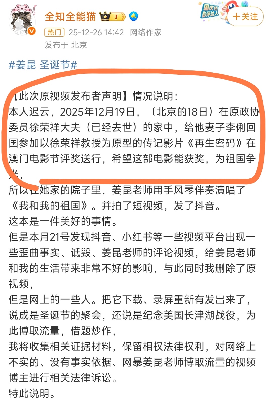 真的看不得姜昆老师被这么冤枉!视频原发布者都出来澄清了,还不够清楚吗?12月19号在洛杉矶朋友家给人送行,即兴唱首《我和我的祖国》,多温情的事儿啊,硬是被有心人蹭着圣诞节炒成“崇洋媚外”。说什么在国外过洋节、买豪宅,纯属瞎编!房子是已故徐荣祥大夫的,跟姜昆老师半毛钱关系没有。人家在海外还惦记着唱祖国的歌,这份情怀多难得?之前多少回为灾区义演、海外传播中国曲艺,哪件不是实打实的爱国举动?就因为助理一开始没弄清情况乱辟谣,反而让真相被掩盖,姜昆老师平白受了这么多骂。正常的朋友聚会送行,怎么就成了被攻击的靶点?看着他被断章取义泼脏水,真的太委屈了!造谣的人良心不会痛吗?