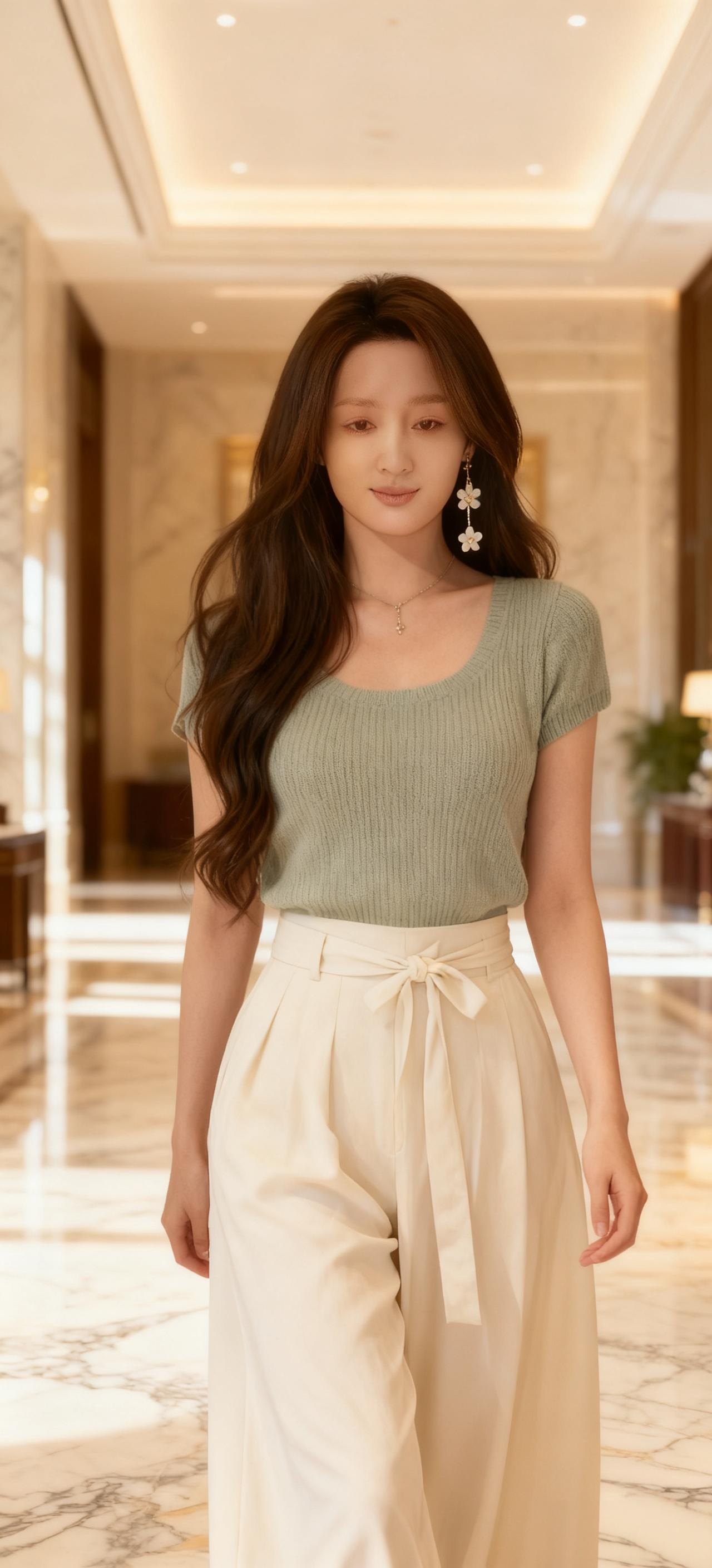 身着浅灰绿色短袖针织上衣,搭配米白色高腰系带阔腿裙裤,简约的浅色系搭配清新温婉,系带设计勾勒腰线,整体造型尽显优雅。
