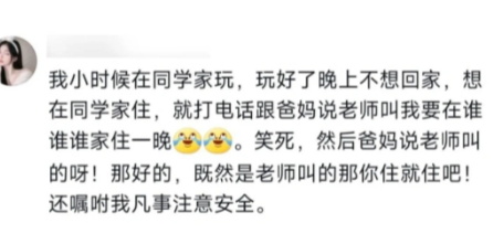 我小时候在同学家玩,玩好了晚上不想回家,想在同学家住,就打电话跟爸妈说老师叫我要在谁谁谁家住一晚[,笑死,然后爸妈说老师叫的呀!那好的,既然是老师叫的那你住就住吧!还嘱咐我凡事注意安全。