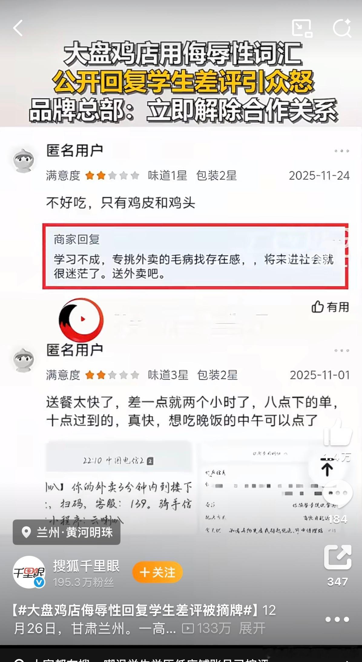 大盘鸡店侮辱性回复学生差评被摘牌小时候最爱去的快餐叫兰州拉面后来去了兰州发现兰州