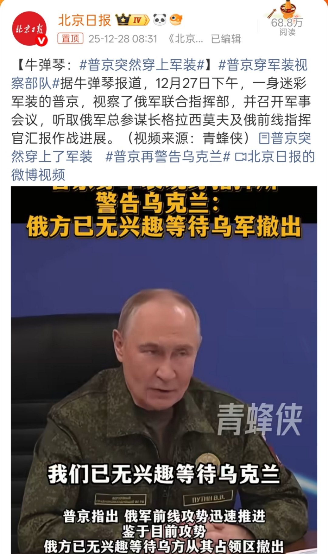 普京突然穿上军装俄乌战争现在也挺离谱的,每次有谈和消息传出,前线就打得更激烈。