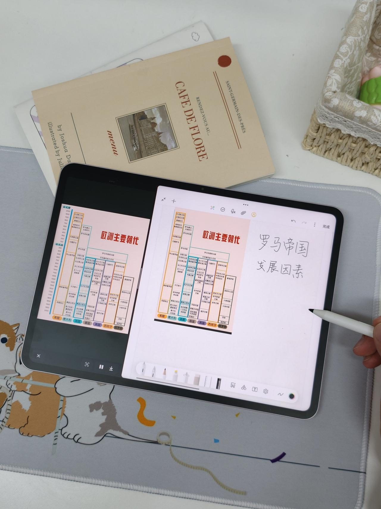 oppo pad air5到手两天,本以为很一般 其实一两千的oppo平板还是可以的,起码我看视频、看网课、记笔记等过程是很流畅的,感觉性价比很高。 12.1寸的屏幕挺大的,看视频画面和声音都可以,而且我这款是柔光屏,摸上去是磨砂质感,室内头顶有很亮的灯光照射过来不会反光,看电视剧很爽。 我一开始买这平板是为了学习,可以分屏一边看课件、网课一边写笔记,我用的原装手写笔,感觉基本没有延迟,搭配柔光屏的书写感不错。 学习功能我摸索出了两个,一个是AI截图,分屏的时候可以截图屏幕内容然后粘贴到笔记上,这样一篇图文并茂的笔记就有了,后面复习很容易找到重点。还有是AI字迹美化,字不好看的我也能写一手漂亮字,感觉很实用。 我看电池有一万多毫安时,实测简单看视频和记笔记能用两天,到外面图书馆都不用带充电器。 总的来说,要是拿来看视频、学习是很够用的,oppo pad air5基本很流畅,几个小功能还很适合学习,而且粉色平板好看还不重,适合女生,现在买还送壳子和手写笔,国补后低至1700多,柔光版要稍微贵一丢丢,性价比挺高的。 OPPO平板 Air5 平板 大学生平板 平板电脑 学生党平板 使用体验 OPPOPad