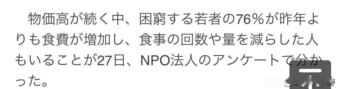 根据日本NPO调查,由于日本物价的上涨,很多年轻人都把一日三餐减少到二餐、一餐,尤其从地方到东京的年轻人,他们要付高额的房租、要还学贷…表面看着工资挺高的,到手过日子的钱剩不了几个,正是年轻力壮的年龄就过着贫穷生活,更何况年老体衰的老人。
