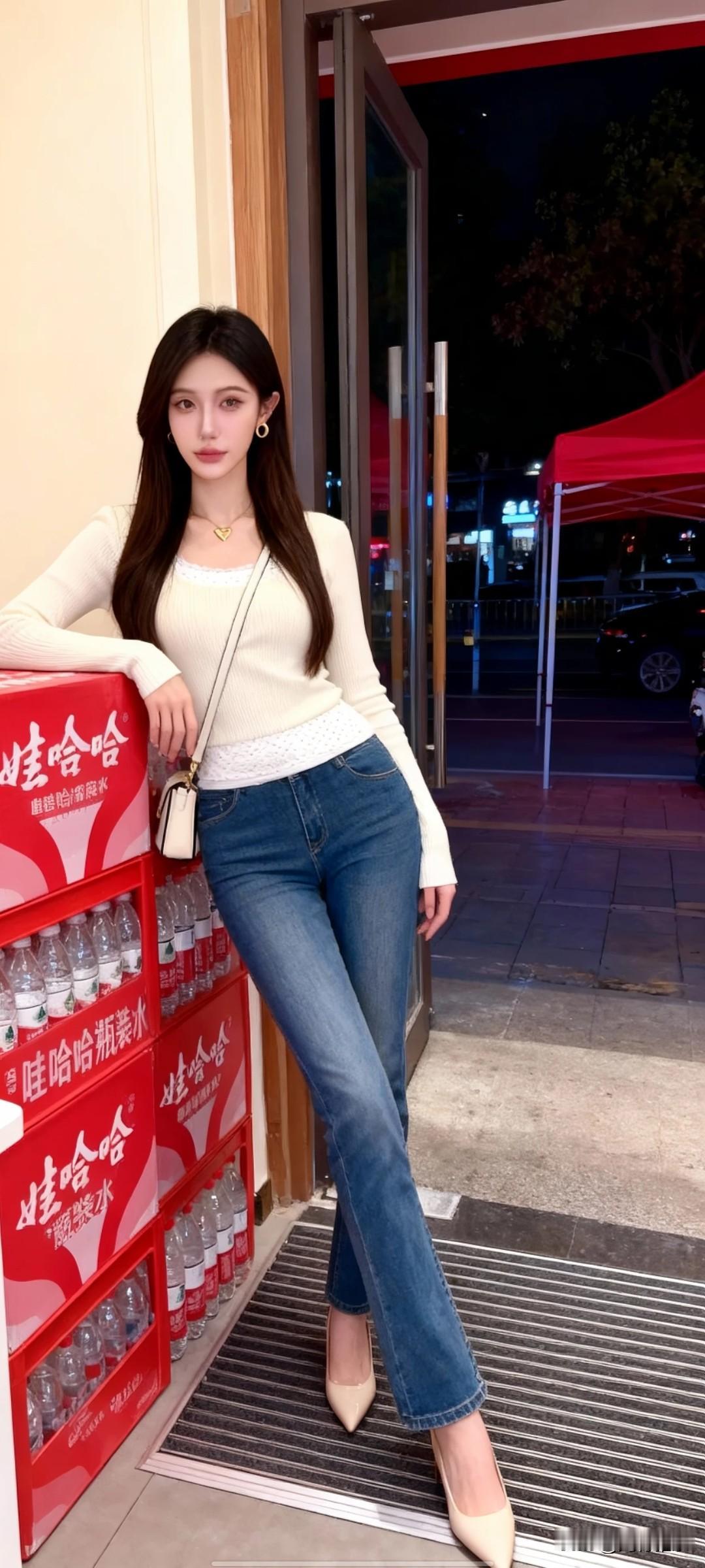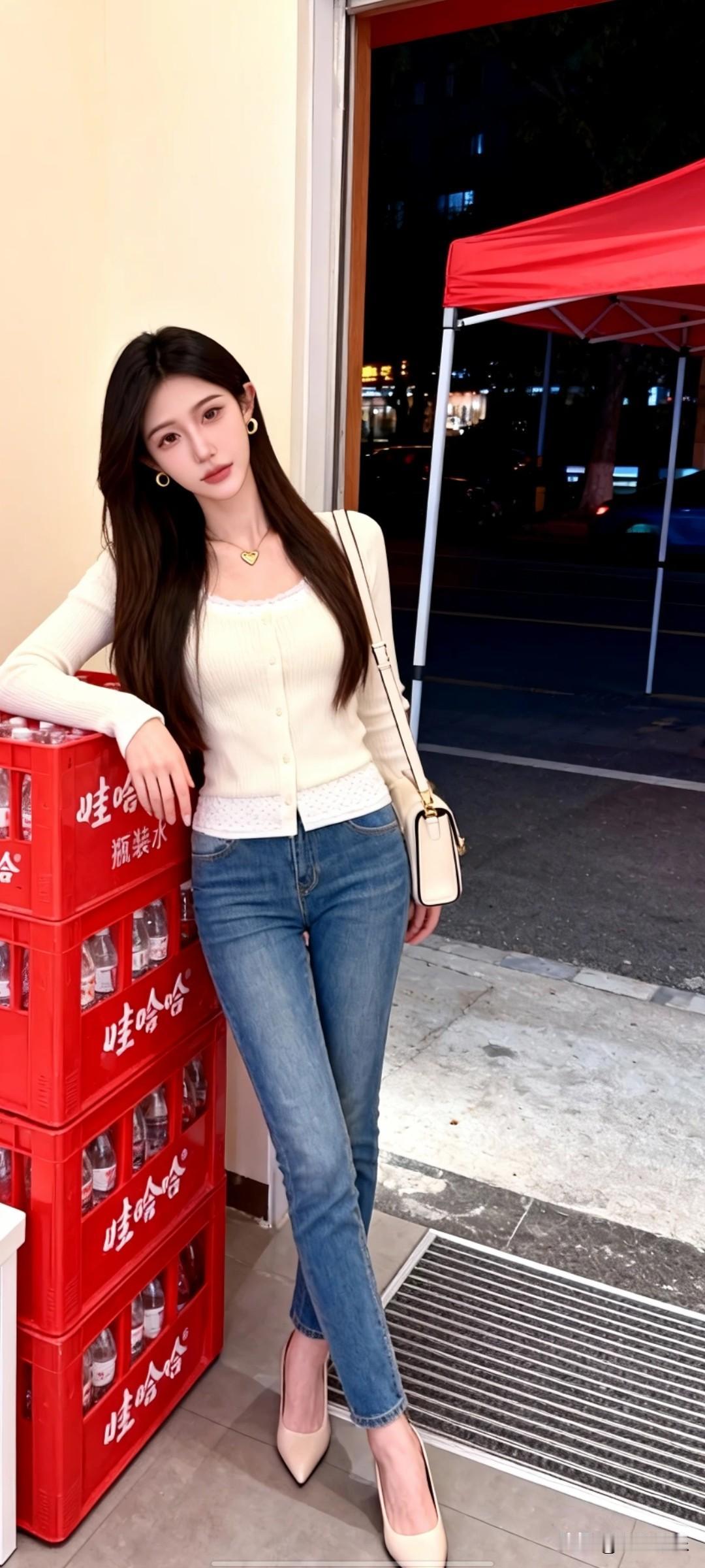 女人如何穿出含蓄的性感? 室内小店场景,女子身着白色针织开衫、蓝色牛仔裤,脚穿浅色高跟鞋,倚靠在堆叠的红色“哇哈哈瓶装水”箱旁。背景可见白色小桌、门口的防滑垫,门外是夜晚的街道与红色帐篷,整体氛围充满市井小店的烟火气,色调暖中带点夜景的氛围感。