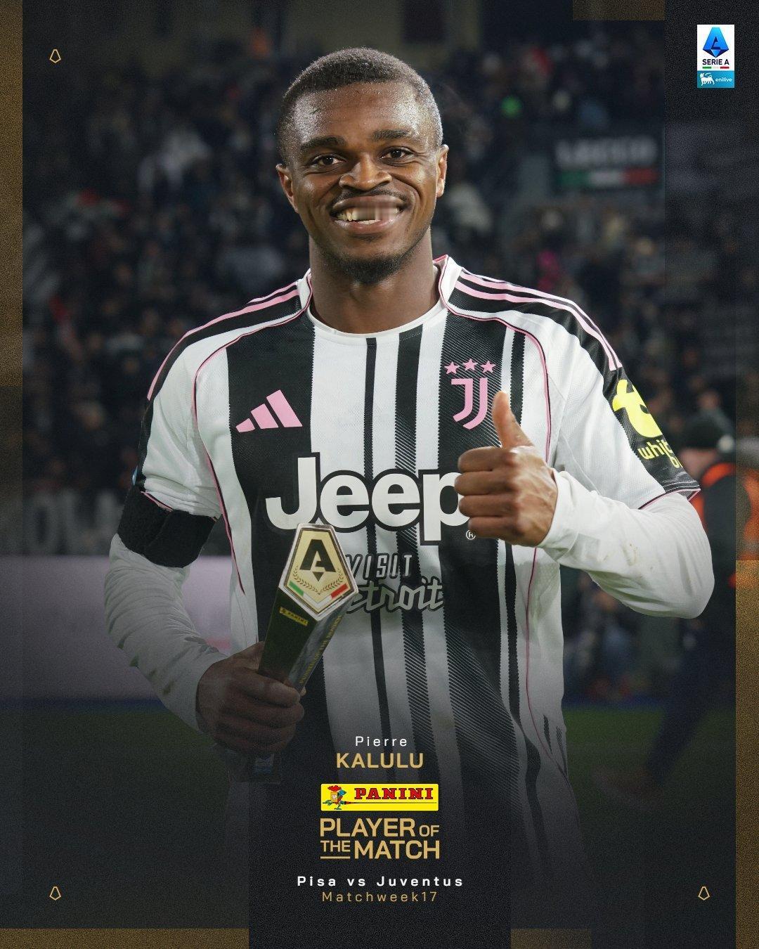 尤文2:0比萨全场最佳球员。 卡卢卢2160分钟全勤,本赛季至今尤文全部24场比赛他均是首发并踢满90分钟。👏
