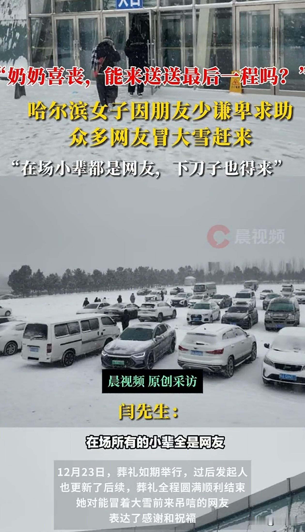 看哭了!黑龙江哈尔滨,女子90多岁的奶奶喜丧,可她身边一个能来送一程的朋友都没有,女子就求助网友,没想到不少人纷纷前来参加葬礼,把女子感动坏了。网友:“这才是互联网的意义!” 这姑娘是个“i人”(性格内向的人),社交圈子小,身边的朋友又都不在哈尔滨 她不想让奶奶走得冷冷清清,可自己实在没招儿了,一咬牙,就在网上发了封“求助信”,恳请陌生网友来送奶奶最后一程 她还在信里特实在地说,车费都能给报销,到场的还有礼品,以后网友要是有啥需要跑腿帮忙的,她也绝不推辞 这封信发出去后一下子火了,引来了几千名网友声援 到了12月23日葬礼那天,哈尔滨下了好大的雪,路特别难走。可就是这样的天气,还真有网友从四面八方赶来了 有位从浙江来旅游的叶先生,特意调整了行程,和女朋友冒着大雪,几经周折才赶到现场 本地一位闫先生,忙完工作到家都凌晨三点了,怕睡过头耽误事,干脆没怎么睡,提前就往地方赶 他说了句特别实在又特别硬气的话:“白事不能迟到,天上下刀子也得来!” 到了现场一看,姑娘身边的同龄小辈,清一色全是闻讯赶来的网友 有网友觉得,姑娘能为了奶奶鼓足勇气向陌生人开口,这份对长辈的孝心和爱,压过了她自己的拘谨和不安,说明爱能给人带来意想不到的勇气,为了心里最重要的人,我们都可能做出自己都想不到的事 网友们的“赴约”,可真是雪中送炭的情分。大冬天的,还是葬礼,搁谁都得掂量下 但大家为啥来?就是将心比心!就像闫先生想的,“要是换了我处在她的境地,我也希望有人能来帮一把。” 这场特殊的送行,真的给了“喜丧”最好的注解。奶奶九十高寿,是福气;临走时,有这么多陌生孩子,因为一份善意聚在一起,热热闹闹地送她,这更是种温暖的圆满 生命的终点,除了泪水,也可以充满善意和尊重
