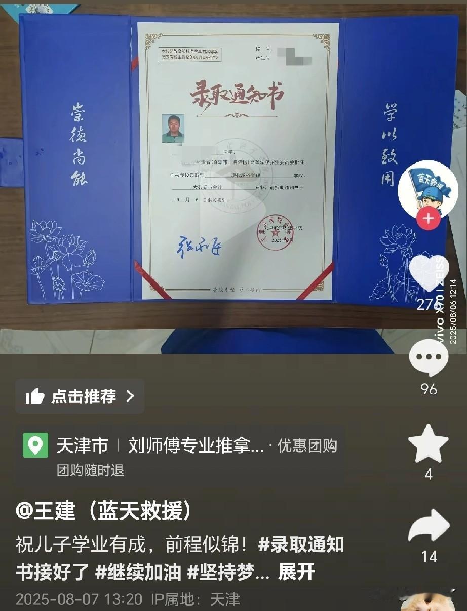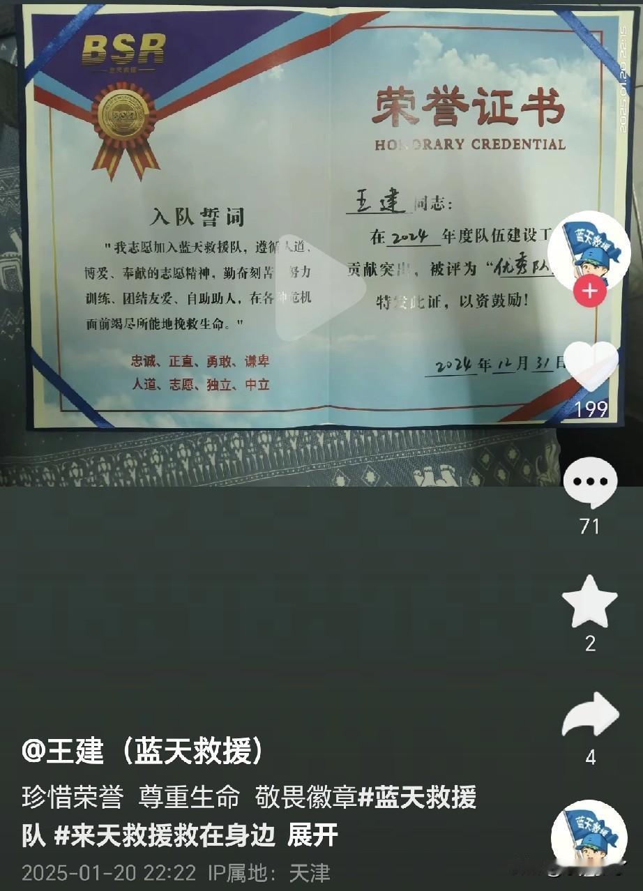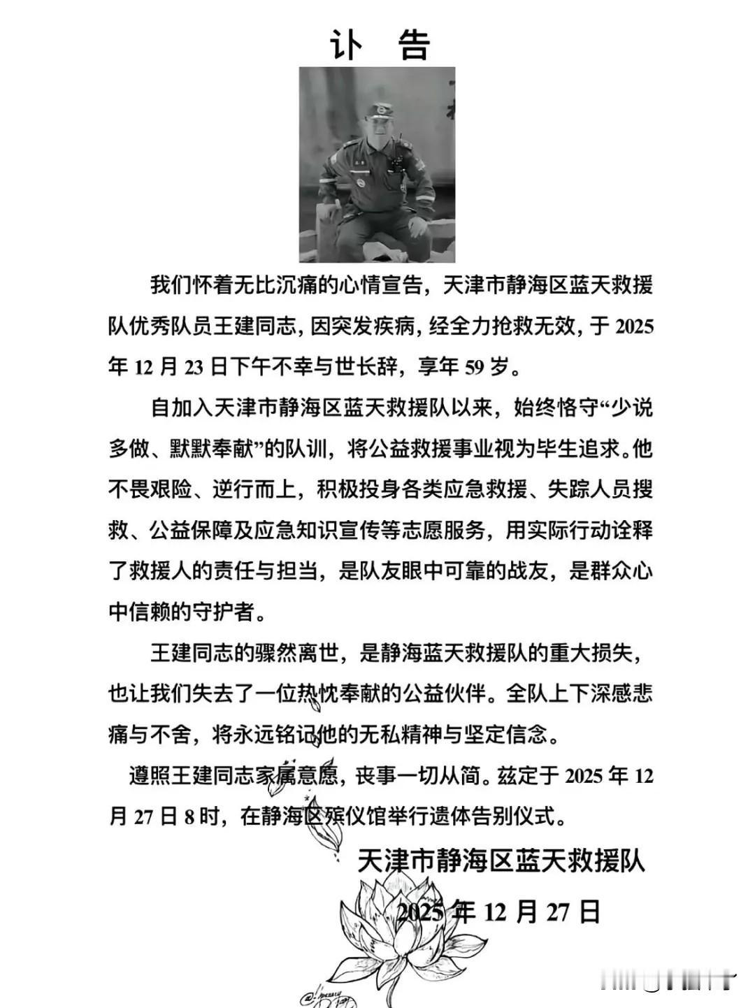 12月23号,天津蓝天救援队员王建突发疾病去世,享年59岁,一些基本情况曝光!生前从事中国人寿保险行业,而且业绩不错是静海区区域经理,从职业特殊性考虑,需要每天和客户进行沟通,如此累心,还能够坚持干公益,这种精神让人敬佩! 有一个儿子,8月份才考上了天津滨海职业学院,除了希望学业有成之外,还多次带他参观蓝天救援队装备库和荣誉室,也在暗示,男子汉,要有一种“路见不平拔刀”相助的品质。 关于身体素质,平时还不错,有滑雪的习惯,而且在8月份还完成了突破自我的挑战之夜爬泰山。 关于什么病,并没有说,猜测和心梗有很大关系,因为太突然了,12月19号还更新了视频,完全看不出住院之类的情况,哎,家属节哀吧。 其实,这段时间,全国各地蓝天救援队因病离开的很多,比如:山东枣庄49岁的李苍沧心脏病,重庆36岁的李舟,山西吕梁36岁的李宏伟…,希望帮助别人的同时,多关注自己的身体。