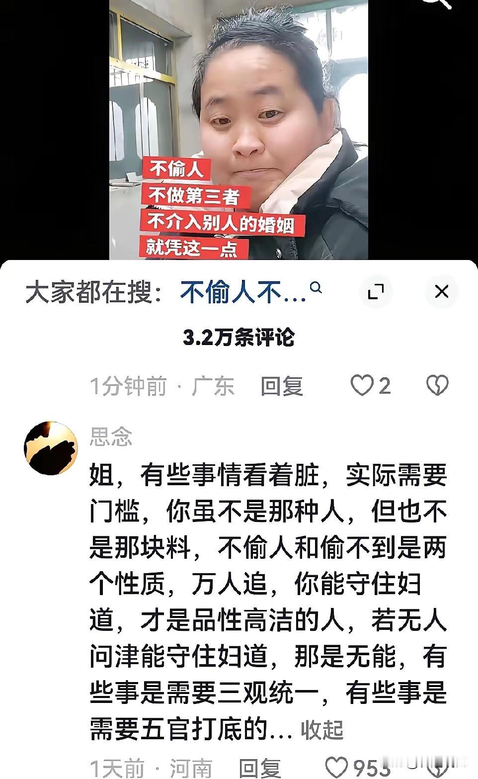 看到这个网友的神回复,才知道有些事情是需要门槛的, 可以说,这位女士对于自己没有出轨是非常的自豪,非常的自信,眼神中透露着坚定,按理说能做到不偷人,不做第三者,不介入别人的婚姻,这已经非常了不起了。 但是这个网友夸人的技术确实是高,直接点出这位女士不是那块料。