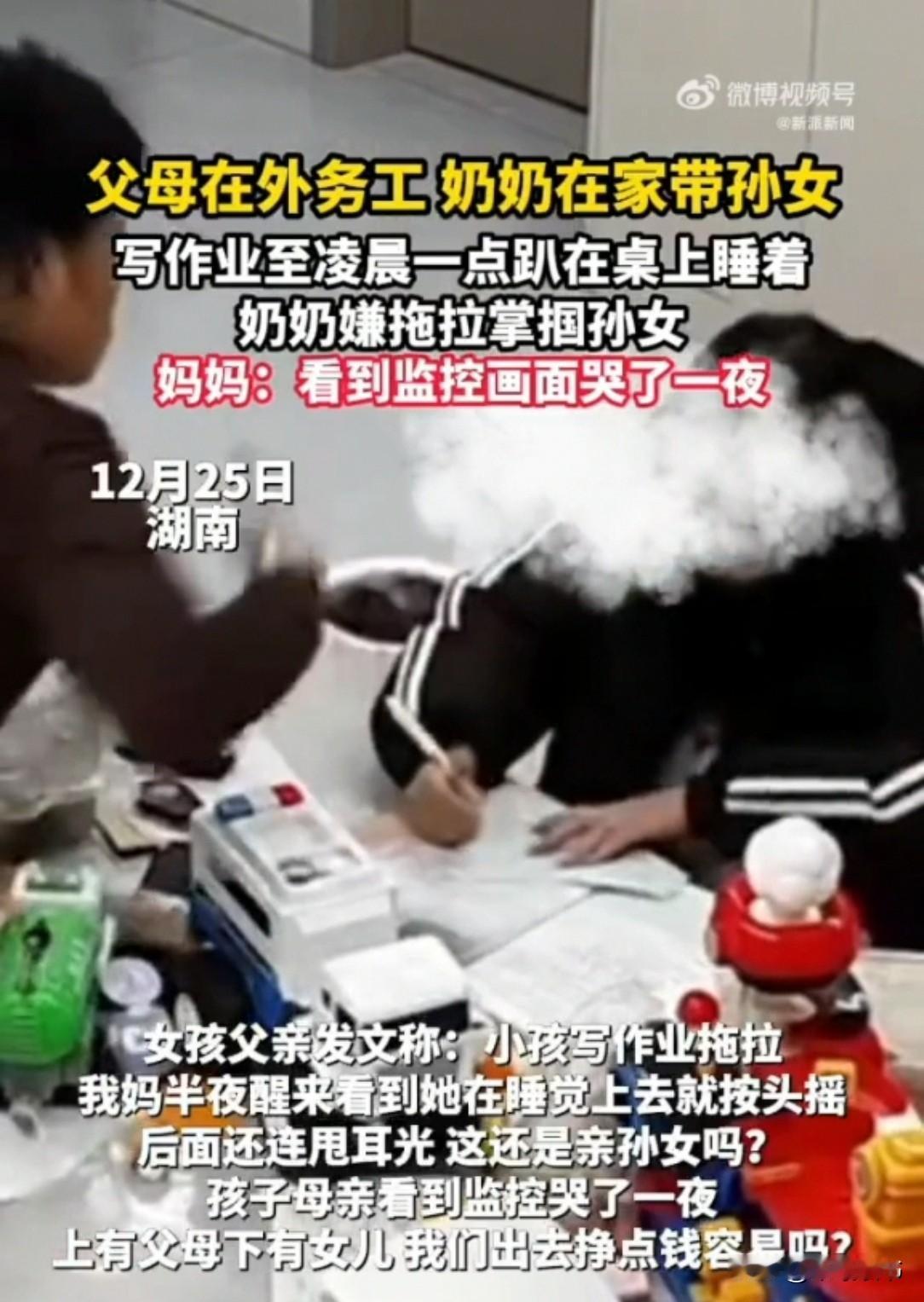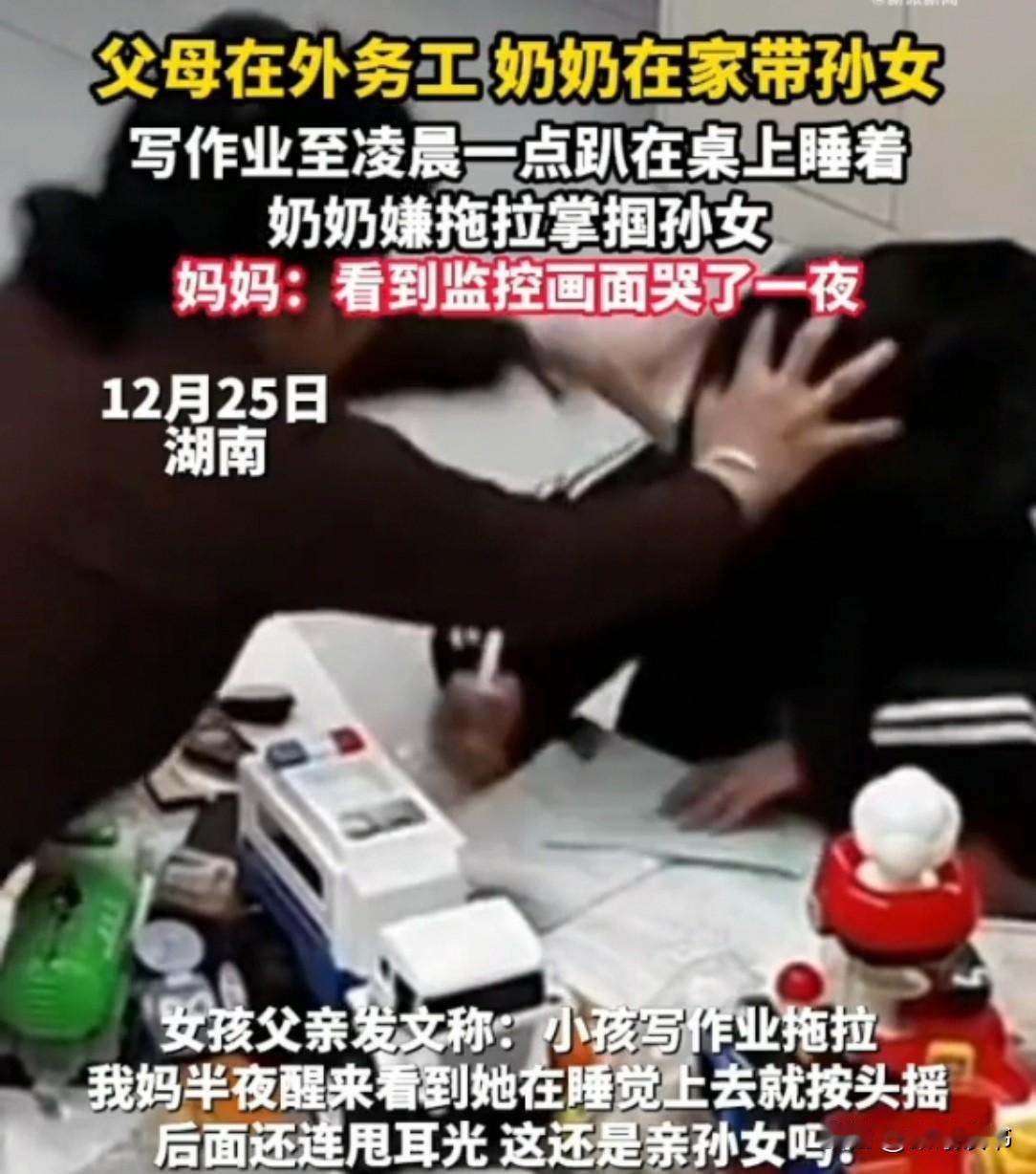 凌晨1点,在外打工的母亲想女儿,点开家里监控。屏幕里,女儿握笔趴在桌上,累得睡着了。母亲心里正发酸,突然听见“啪”的一声——奶奶起夜看见孙女在睡觉,抬手就扇耳光,一下接一下地打。 这天是平安夜,湖南一女孩正在客厅里写作业,突然听见外面传来的嬉闹声:“快点快点,再晚苹果就被抢光了!”“听说广场有圣诞树,咱们去拍照吧!” 女孩听的心里有些羡慕,她也好想出去玩呀,可看着桌子上的作业,默默地低下了头。 客厅的沙发上,奶奶正斜靠着看电视,肥皂剧的台词和笑声断断续续地飘过来。 她偶尔转头瞥一眼书桌前的小身影,见孙女埋头写作业,满意地点点头,随即继续转头看电视去了。 墙上的挂钟滴答作响,指针慢慢爬到了晚上十点。 奶奶打了个长长的哈欠,揉着发胀的太阳穴站起身,走到书桌旁扫了一眼,眉头瞬间皱了起来。“怎么写个作业写这么久?” 她的声音带着困倦的不耐烦,手指在作业本上重重戳了一下,“我像你这么大的时候,早就把家务做完睡了,哪有这么多磨磨蹭蹭的!” 女孩的肩膀缩了缩,握着笔的手紧了紧,小声说:“奶奶,还有三张卷子没写完……” “借口!”奶奶打断她的话,转身往卧室走,拖鞋在地板上踩出重重的声响,“快点写,别偷懒!写完了再睡觉!” 房门被“砰”地一声关上,女孩的眼泪在眼眶里打转,却不敢掉下来。她吸了吸鼻子,继续埋头写作业。 窗外的喧嚣渐渐平息,只有挂钟的滴答声在寂静的客厅里格外清晰。眼皮越来越重,像坠了两块铅,她使劲眨了眨眼,笔尖却开始不受控制地歪斜。 十二点的钟声敲响时,女孩的头终于抵不住重力,“咚”地一声磕在书桌上,握着笔的手还保持着写字的姿势,呼吸渐渐变得均匀绵长。 千里之外的出租屋里,女孩母亲翻来覆去睡不着。平安夜的夜晚,她格外想念女儿。 她摸出手机,点开家里的监控画面,当看到屏幕里女儿趴在桌上熟睡的模样时,瞬间心疼坏了。 就在这时,一声清脆的“啪”声从手机里传来。 画面里,奶奶穿着睡衣从卧室走出来,看见趴在桌上的孙女,脸色瞬间沉了下来。 她几步走到书桌前,二话不说,抬手就朝着孙女的脸颊扇了一耳光。 女孩猛地惊醒,懵懵懂懂地抬起头,还没反应过来,又被奶奶按住后脑勺使劲摇晃,耳光接连不断地落在她的脸上,“啪、啪、啪”的声响,在寂静的深夜里格外刺耳。 “让你偷懒!让你不写完作业就睡觉!我怎么教你的!”奶奶的声音带着暴怒,眼神里满是不耐烦。 女孩的脸很快就红了起来,眼泪顺着脸颊往下淌,却不敢哭出声。 她只是低着头,右手握着笔尖,一边继续写作业,一边默默承受这顿打,连抬手挡一下的意思都没有。 那副逆来顺受的模样,像是早已习惯了这样的对待。 出租屋里的女孩母亲,看着监控画面里的一切,浑身发抖,她捂着嘴,不敢发出声音,喉咙里却像堵了一团棉花,疼得喘不过气。 她就那样盯着手机屏幕,看着女儿默默承受着一切,直到画面里的奶奶骂骂咧咧地转身回了卧室,看到女儿从头到尾没有反抗。 那一夜,女孩母亲哭了整整一夜。 第二天一早,她叫醒还在睡梦中的丈夫,把那段监控视频给丈夫看,“我们把女儿接过来吧,再苦再累,也不能让孩子再受这种委屈了。” 丈夫看着妻子通红的眼睛,重重地点了点头。“好,接过来,我们自己带。” “棍棒底下出孝子”早就过时了,打骂换不来好孩子,只会伤了孩子的心。故事里的女孩懂事得让人心疼,幸好父母及时察觉,选择亲自守护孩子。 愿每个孩子都能在温暖的陪伴里长大,而非在恐惧中小心翼翼!