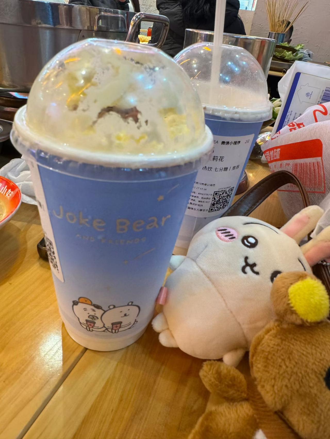 今天下午终于和好朋友约上了,两个人出来逛逛买买,简直太开心了! 逛到一家叫“Joke Bear”的店,我俩一眼就相中了这两个毛绒玩偶,胖兔子配憨小熊,看着就喜庆,立马拿下当“战利品”。手里拎着新玩具,肚子也开始咕咕叫,果断钻进火锅店。 热气腾腾的火锅一上来,把刚才逛街的累全赶跑了。一边大口吃肉,一边喝着奶茶,还要跟朋友吐槽这吐槽那,笑得腮帮子都疼。这一下午,有吃有喝还有人陪聊,这才是周末该有的样子嘛,爽歪歪!
