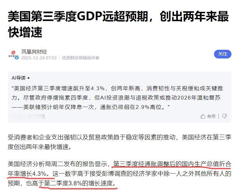 中美第三季度GDP差距断崖:美暴涨4.3%,总额7.8万亿,中国多少? 之前大家聊起中美经济,不少人都觉得差距在慢慢缩小,尤其是看着美国国债一路攀升,更是觉得其经济压力不小。 可就在最近,拖了将近两个月才公布的美国第三季度GDP数据,直接打破了这种固有印象,让不少人惊呼“意外”。 美国商务部公布的首次预估数据显示,三季度实际GDP环比按年率增长4.3%,不仅比市场预期高了1个百分点,还创下了2023年第四季度以来的最快增速,总量更是冲到了7.8万亿美元。 这时候大家最关心的问题来了:美国经济“突然发力”,中国第三季度GDP又是什么水平?两者的差距真的出现“断崖式”扩大了吗? 先给大家报个准数,中国国家统计局早在10月就公布了三季度GDP数据,单季绝对额达到354500亿元人民币,同比增长4.8%,前三季度累计更是突破百万亿元大关,达到1015036亿元,同比增长5.2%。 可能有人会直接换算成美元来对比,按三季度7.129的平均汇率计算,中国三季度GDP约为4.97万亿美元,和美国的7.8万亿美元相比,差距确实达到了2.8万亿美元左右,比去年同期有所扩大。 但要是只看这个数字就觉得中美经济差距在“断崖式”拉大,那就有点太片面了,这里面藏着两个关键的“数字陷阱”,得用大白话给大家拆解清楚。 第一个就是增速统计口径的差异,这俩根本不是“同一个赛道”的比拼。中国说的4.8%增速是“同比”,也就是和2024年三季度的经济总量比出来的,反映的是一年时间里的真实增长幅度; 而美国的4.3%是“环比折年率”,简单说就是把三季度和二季度相比的增速放大4倍,折算成全年的增长水平,相当于在说“如果接下来三个季度都保持这个节奏,全年增速能到4.3%”。 要是把美国的增速也换成同比口径,实际只有2.3%,远低于中国的4.8%。这就像拿百米冲刺的瞬时速度和马拉松的阶段速度比,根本没有直接可比性。 而且美国一季度经济还是负增长,四季度还面临政府停摆等不确定性,多家机构预测其全年增速也就2%左右,这种单季度的“暴涨”更像是短期冲刺,而非稳定前行。 第二个关键是美国GDP的“虚胖”成分不少。美国三季度GDP能超预期,主要靠两个短期因素支撑:一是占经济总量70%的个人消费支出增长3.5%,拉动GDP增长2.39个百分点;二是出口增长8.8%,净出口拉动经济增长1.59个百分点。 但这里要注意,美国同期物价涨幅可不低,三季度核心PCE物价指数达到2.9%,仍高于美联储2%的目标,也就是说消费增长里有不少是物价上涨带来的“虚增”。 就像一杯星巴克拿铁去年卖5美元,今年涨到6美元,销量没变化,但GDP里就会算成增长20%,这种增长并没有带来居民实际购买力的同步提升。 反观中国,增长动力更扎实,三季度工业增长5.8%,制造业增长6.3%,尤其是信息传输、软件和信息技术服务业增速高达11.7%,这些都是实打实的产业升级和产能扩张带来的增长,含金量更高。 还要说说大家容易忽略的一点,美国经济的“亮眼数据”背后,还藏着严重的内部分化。 虽然消费支出看似强劲,但美国12月消费者信心指数已经连续五个月下滑,跌至今年4月以来的最低水平。 这是因为物价高企一直在侵蚀居民的实际购买力,尤其是低收入群体,工资涨幅赶不上物价涨幅,日子并不好过。 而高收入群体则受益于美股牛市的财富效应,高端消费旺盛,形成了明显的“K型分化”。这种靠少数人消费拉动的增长,根本不具备可持续性。 评价中美经济差距不能只看单季度的GDP数字和汇率换算后的差额。 中国经济走的是“稳步爬楼梯”的路子,注重产业升级和内生动力培育,虽然增速没有美国单季度那么“惊艳”,但胜在稳定、扎实; 而美国三季度的经济“暴涨”更像是短期政策刺激和统计口径带来的“数字繁荣”,背后藏着通胀黏性、结构分化等隐忧。 对于我们来说,不用被短期的数字差距打乱节奏,聚焦自身的高质量发展,扎实推进产业升级和内需扩张,才是保持经济韧性的关键。 毕竟,经济竞争是一场马拉松,不是百米冲刺,一时的快慢说明不了什么,长期的稳定前行才更重要。