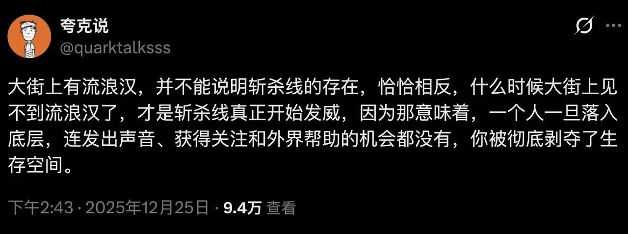 只因为死了400人所以斩杀线不存在?本来大多数网民对斩杀线无感,结果那些给斩杀线洗地的反而让人都知道斩杀线哈。 400万人口每年死400个流浪汉不算什么?要是在国内,一个400万人口的城市每年死400个流浪汉,这个城市只怕要从上到下都得问责。 还有的人试图把祸水引向中国,称大街上看不到流浪汉才可怕。哈,不能因为你们国家大街上到处是流浪汉,就认为其他国家大街上有流浪汉天经地义。 话说某国流浪汉倒是发出了声音,获得了帮助和外界关注的机会吗?不一样是陷入斩杀线吗? 这地洗的,也太敷衍了吧。