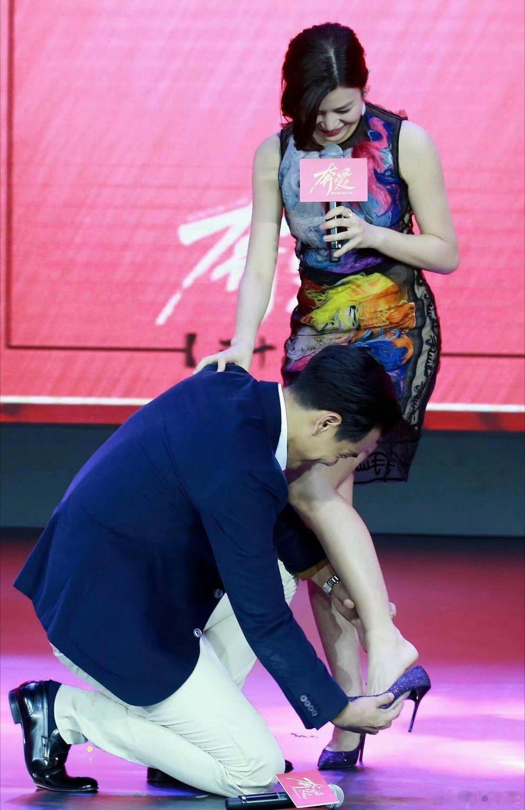 2016年《奔爱》首映礼。彭于晏单膝跪地帮陈妍希穿高跟鞋,姐姐的脸上笑开了花。话说姐姐这jiojio好白净