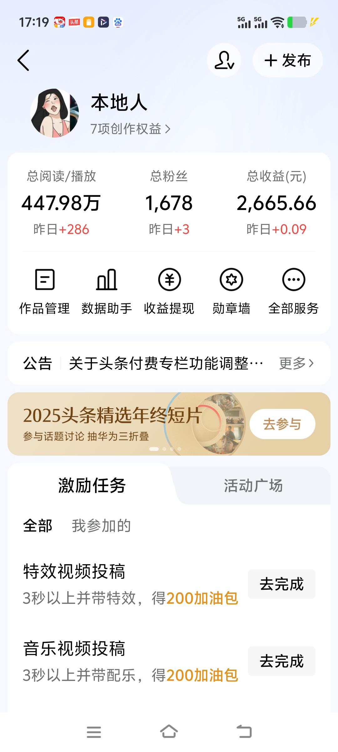 头条啊,真的别再改规则了。去年我一天能赚三四百,今年却只能赚9分钱,我都不确定自己是否还有坚持下去的必要。唉,我一心想紧跟你的潮流,不断调整自己,可无论我怎么改变,你都不肯给我流量。你到底喜欢什么样的文章呢? 而且最近我特意看了看你推荐的文章,基本都是官方媒体号发布的,像我们这些小作家写的内容,基本刷不到了,那些无病呻吟的文章也看不到了。可你知道吗?我之所以长期留在头条,是因为我想了解像我一样的同龄人,他们的看法是什么,他们无病呻吟的理由是什么,我只想以同理心去了解一下。你现在倒好,全是官方新闻,那我直接去看新闻联播不就行了。