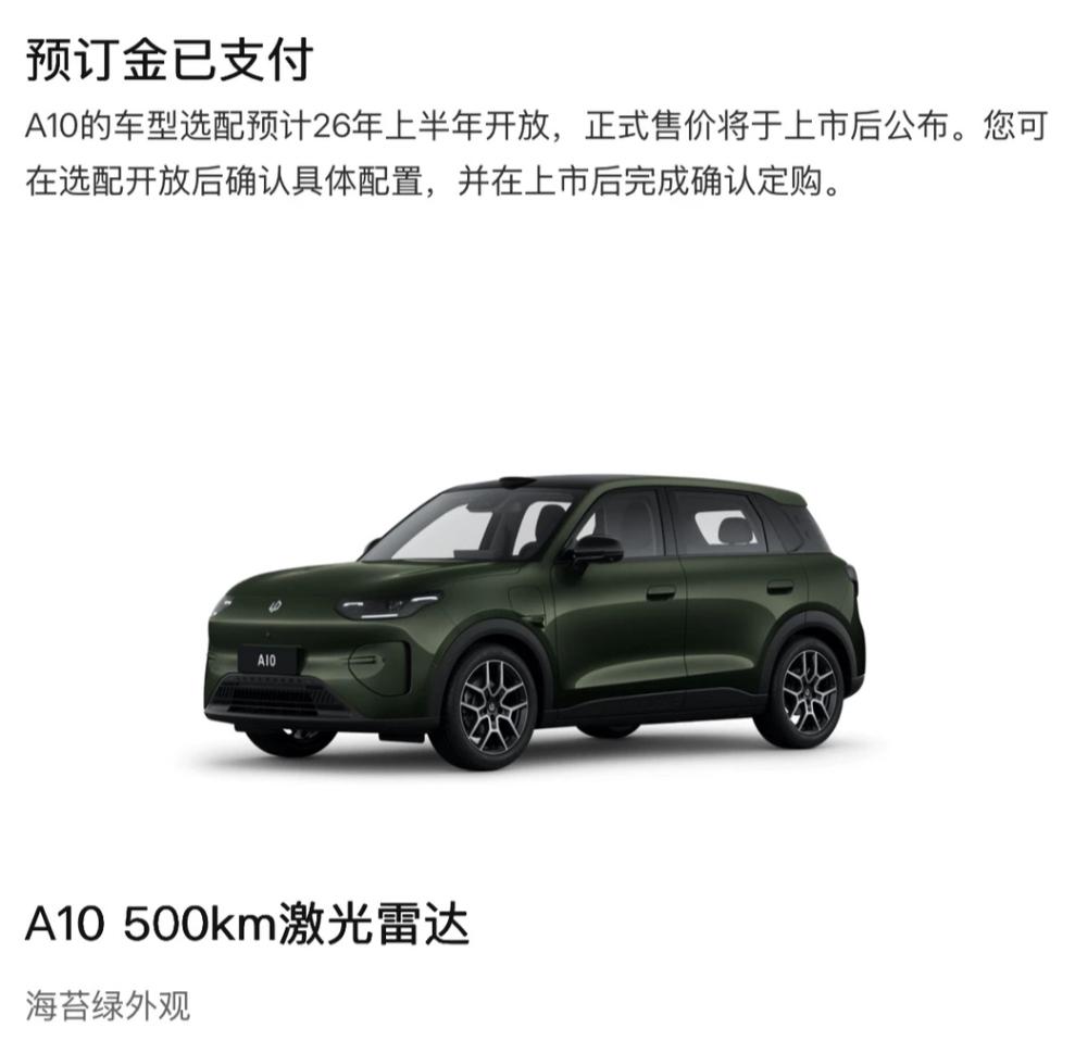 看完星愿、元UP和名爵MG4,本来比较心仪星愿,但自从零跑A10的消息出来后,我的注意力就被它吸走了,这部车配置高的离谱。 A10有500续航和激光雷达,还有高通的8650智驾芯片,自动泊车非常得我心。配置直接把同级对手秒了。我现在看其他新车,和A10一对比就觉得“好像也就那样”,盲定99已经付了,有没有人知道啥时候上市?【来自懂车帝车友圈】
