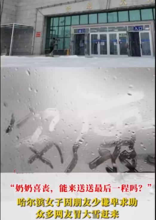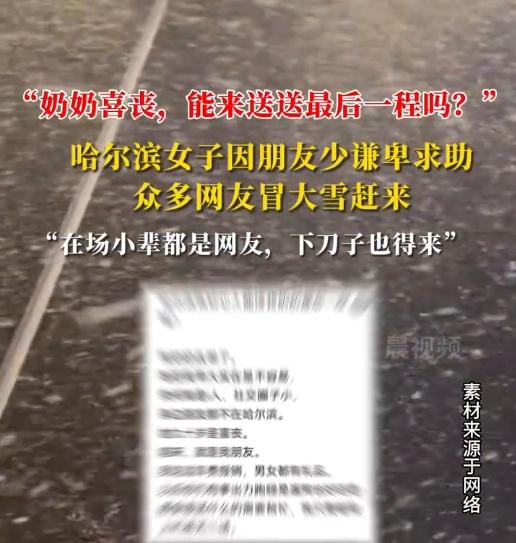 奶奶喜丧,能来送送最后一程吗?”近日,黑龙江哈尔滨一位网友的求助信,如同一束光照进了冬日的寒冷里。这名网友因90岁奶奶“喜丧”,却苦于自己朋友不多且都不在本地,不想让奶奶走得孤单,便在社交平台向网友发出了真挚邀约。 这封求助信迅速引发数千名网友声援,大家纷纷以自己的方式给予支持,有人踊跃报名表示会亲临现场,有人因无法前往便积极支招,字里行间都是温暖。 12月23日,葬礼当天,哈尔滨迎来了一场难得一见的大雪。雪花纷飞,给出行带来极大不便,打车困难,公交迟缓,道路也因积雪变得拥堵。但这些困难并未阻挡网友们的脚步。来自浙江的叶先生当时正与女友在黑龙江旅行,看到求助信后便将参加葬礼列入行程,他们克服了诸多波折,最终与其他赶来的网友一起,在火化场送了奶奶最后一程。本地的闫先生则是深夜刷到求助信,被发起人的孤独与无奈所触动,尽管忙完工作已凌晨三点,他仍在大雪中按时赴约。 据闫先生回忆,当天准时抵达的网友有三四十人,还有很多人因大雪堵在路上。现场,网友们纷纷来到奶奶的晶棺前,默哀、鞠躬、绕行,庄重而肃穆。葬礼全程圆满顺利,发起人随后更新后续,对冒雪前来的网友表达了深深的感谢与祝福。这场由陌生人组成的送别,充满了温情与善意,让我们看到了人间自有真情在。你被这些网友的善举感动了吗?快来点赞、评论,分享你对这件事的看法,也让更多人感受到这份温暖吧。
