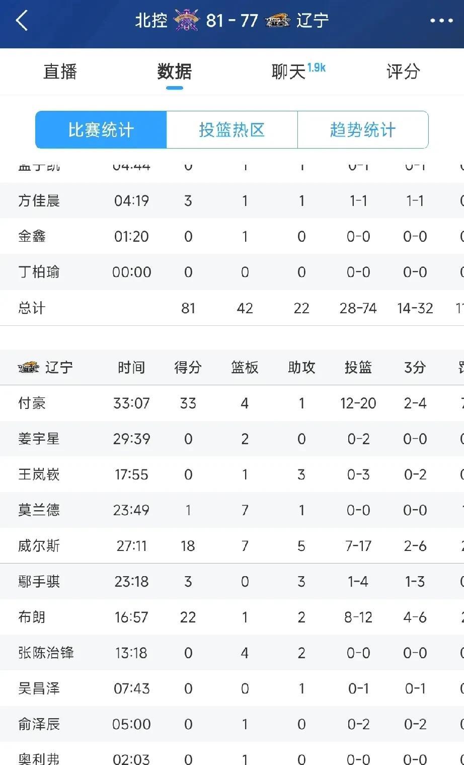 是什么比赛让付豪这么失落! 辽宁男篮对阵北控比赛赛后付豪参加媒体发布会,就简单说了四句话;确实非常失落吧,就是觉得确实很失落,没有别的,谢谢大家! 本场比赛,付豪内外兼修狂砍33分4篮板!其他球员出了两个外援以外,本土球员唯一得分就是鄢手琪的3分,其他球员一分没得,最后比赛当然是4分惜败北控! 这场比赛辽宁男篮暴露的问题国内球员除了付豪没有其他得分点,也是导致比赛失败的原因!