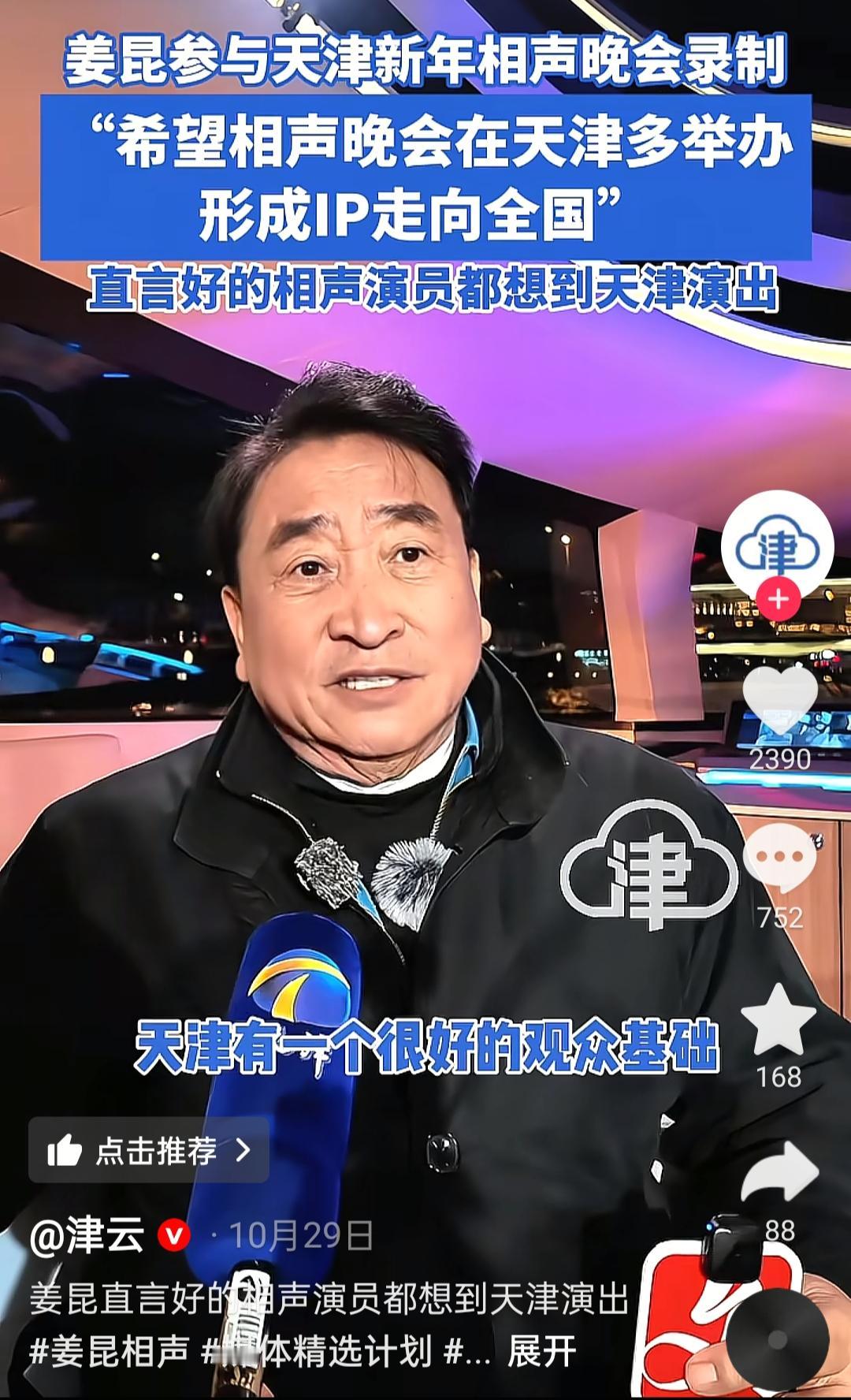 姜昆老师的新相声快与大家见面了。 早在今年10月份,姜昆老师就参与录制了天津卫视新年相声晚会,当时主持人裘英俊就发了与姜昆老师的合影。 姜昆老师在接受当地媒体采访时说:“天津有一个很好的观众基础,好的相声演员都喜欢到天津这里演出,为什么呢?因为观众热情,他懂。” 今年与姜昆老师说相声的还是他的老搭档戴志诚,这两位老搭档合作了不少年了,小到地方演出,大到春晚,都能看到两位老师的身影。 如图二所示,这是流传出来的晚会合照。站在中间的是相声名家马志明先生,站在马先生两边的是姜昆、戴志诚,可以看出前排还有一些知名的青年相声演员。