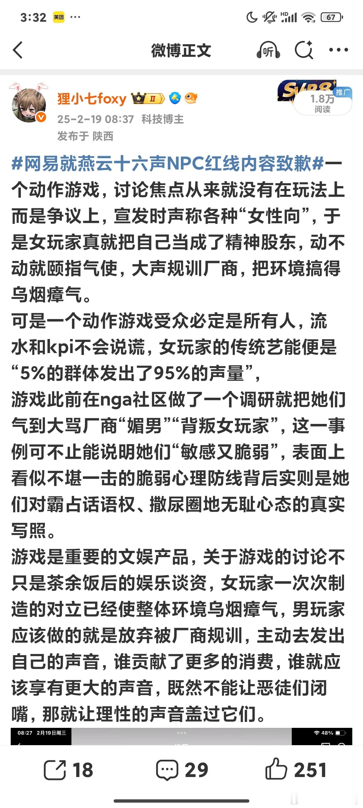 游戏擦边设计是舍本逐末图三,年初那波节奏和年底这波节奏闭环了。燕云早期喜欢搞宣发吸引魔怔(女)玩家埋下的恶果。问题根本就不是擦边不擦边,燕云搞男擦边她们玩的可嗨呢,甚至还要吹燕云搞男擦边就是女性向,云云。游戏,是具有公共属性的文化产品,是对所有群体开放的,游戏公司可以平等取悦任何他希望取悦的人群以扩大受众面。燕云目前遭受的指控,无论是所谓的“情趣内衣”“炼铜”还是其他,本质上是狗哨政治的集中爆发。网易要挺住这波舆情,不能被5%的人群所发出的95%杂音所绑架。