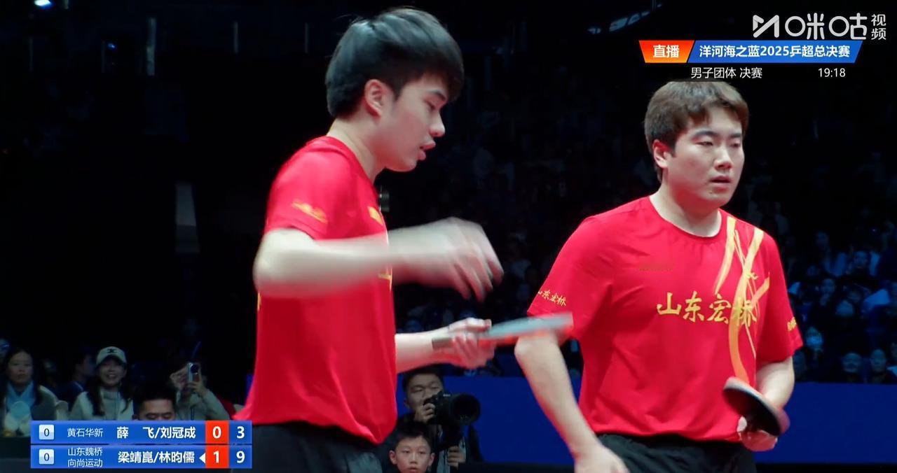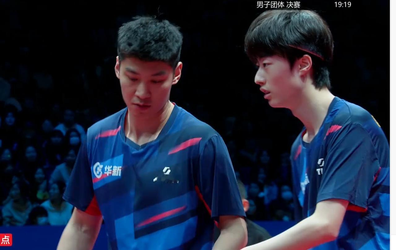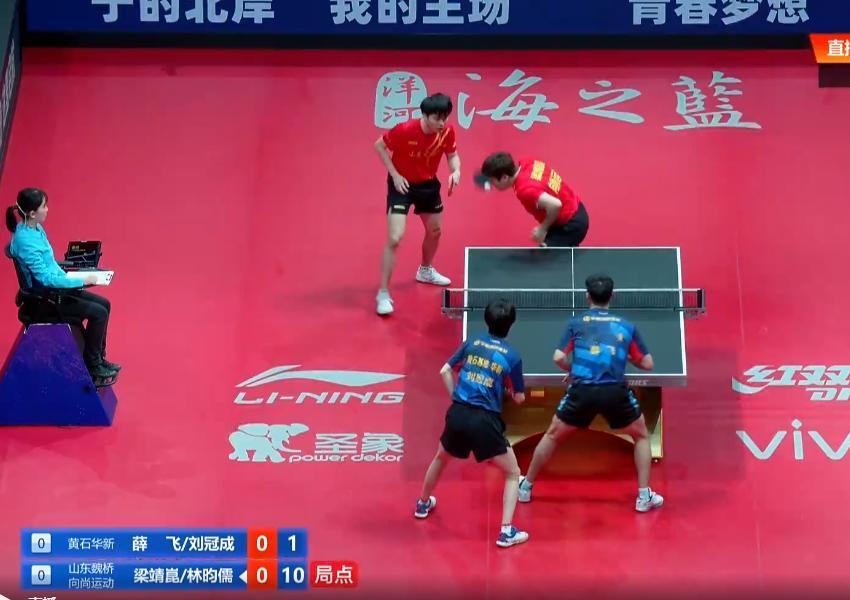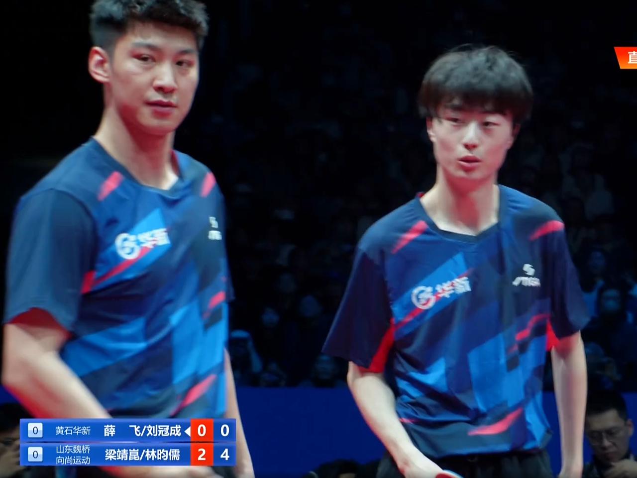 南京总决赛:林昀儒/梁靖崑对战刘冠成/薛飞, 优势太大! 第一局11:1胜 第二局11:4胜 第三局11:5胜 可见两队差距有些大。 小将刘冠成, 第一次上场就是决赛 可能有些紧张, 和其他三人不在一个节奏。 而且刘冠成/薛飞是双右手 全完占下风, 最终0:3输给林昀儒/梁靖崑也正常。