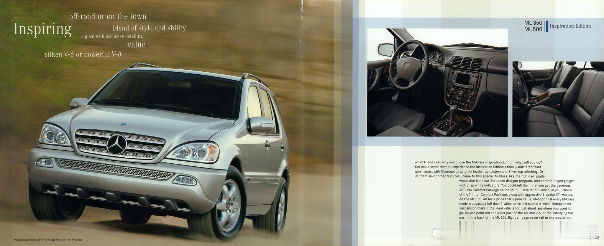 2004年的奔驰ML属于第一代M级(W163),这一代车型从1997年生产至2004年。• 车型背景:奔驰最初计划与三菱合作,基于三菱蒙特罗平台开发SUV,但1992年奔驰放弃该计划,独立开发中级运动SUV。1996年,奔驰AAV Concept概念车发布,奠定了M级舒适豪华、运动休旅的设计基调。1997年2月9日,第一辆M-Class下线。• 车型特点:第一代ML是市场上第一款配备电子稳定控制系统的豪华SUV,在保险行业碰撞测试中获得行业最高分。• 2004年特别版:2004年,为迎接第二代ML的到来,奔驰推出了特别版车型,增加了价值超过4400英镑的配置,包括皮革和阿尔坎塔拉电动运动座椅、黑胡桃木或浅色桦木装饰的仪表板、17英寸合金轮毂、铝制车顶行李架等。