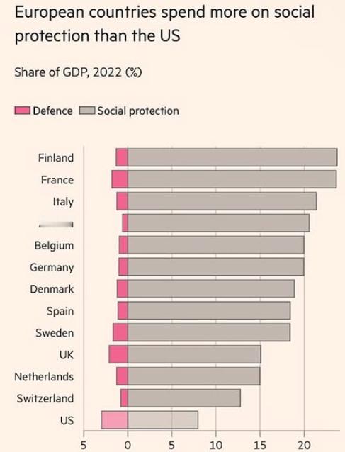 美国奋斗精神还是挺强的,人们看见流浪的跌落中产,就愿意努力奋斗。欧洲搞福利资本主义,彻底不行了欧洲为啥相比美国不行了?数据是真不行,企业竞争力比美国企业差多了。但欧洲政客说,我们福利好,拿人当人。这是真的,欧洲可以算是“福利资本主义”的代表。相比之下,美国是“残忍资本主义”。OECD成员国福利支出占GDP比重从1960年代的10%升至2000年后的20-25%,欧洲一直升,一些国家成为高福利国家代表。美国也升,但后面就不怎么升了。图为国防与社保会保护占GDP比例,美国国防开支明显高,欧洲国家社会保护开支明显高,美国明显不满,让欧洲增加国防开支。有人会说,2025年中国公共部门社会支出占GDP仅6.5%,和欧洲没法比。这要看政策效果。中国从个人收的税少,物价低,公共服务主要是低价免费的,低收入不用交税也能有过得去的生活,需要福利兜底的就少。最近这些年明显看出效果,能批评资本主义了。不在于表面的比例低,而是经济模式里社会主义成份远比美欧多。美国福利,还有羊毛出在羊身上的问题,所谓福利开支其实是美国人自己交的钱,物价还高得离谱,福利开支根本不经花。例如医保,就是美国人自己交的钱,病人把医保钱用完了,余下的钱就不覆盖了。欧洲普遍建立全民医保,美国仍有相当比例人口缺乏医疗保障,医疗债务是家庭破产主因之一。劳动保护方面,欧洲明显比美国强得多,不让随便开除人。美国政府信奉自由放任,政府在社会福利领域干预有限。美国工会臭名昭著,其实只是几个领域成功建立起了工会组织,坑害了行业,很多行业是没有工会的。欧洲工会厉害得多,只是都那样,反而不是大新闻。与欧洲相比,美国犯罪率高、预期寿命短、离婚率高、性别不平等最严重。但欧洲人也失去了奋斗精神,基本全体废物了。美国人也有废物,但比欧洲人好多了,活力明显强。少数有能力的社会精英看见中产跌落的惨样,就会努力奋斗,动力十足。有一个“上岸”文化,成为合伙人,就进精英圈了,彻底安全了,不再是随时会跌落的打工人。有目标,真的会努力。因此,美国社会惨状是真的,但不代表美国竞争力不行,恰恰相反,这正说明美国“残忍资本主义”的厉害。这绝对是精英阶层有意设计的,而且还教育大众,是这些人自己不行,不努力还吸毒。有点类似中国有些买房的,买了就盼着房价继续大涨,别人买不起自己更开心,精英不同情弱者。美国无家可归流浪的一年也就77万人,占总人口的0.2%。让这些人付出代价、横死街头,减寿30岁,整个社会就有奋斗动力,企业明显比欧洲有活力得多。如果美国大搞福利,会死得更快。一个敢让大几十万人在街头流浪的富裕国家,思之恐极,不可小视。
