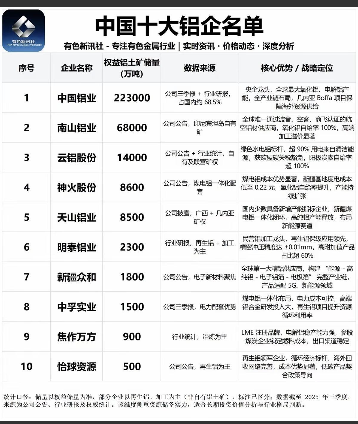 中国十大铝企业上市公司名单! 由于铜继续上涨,铝代铜需求逐步增加,相关核心龙头股: