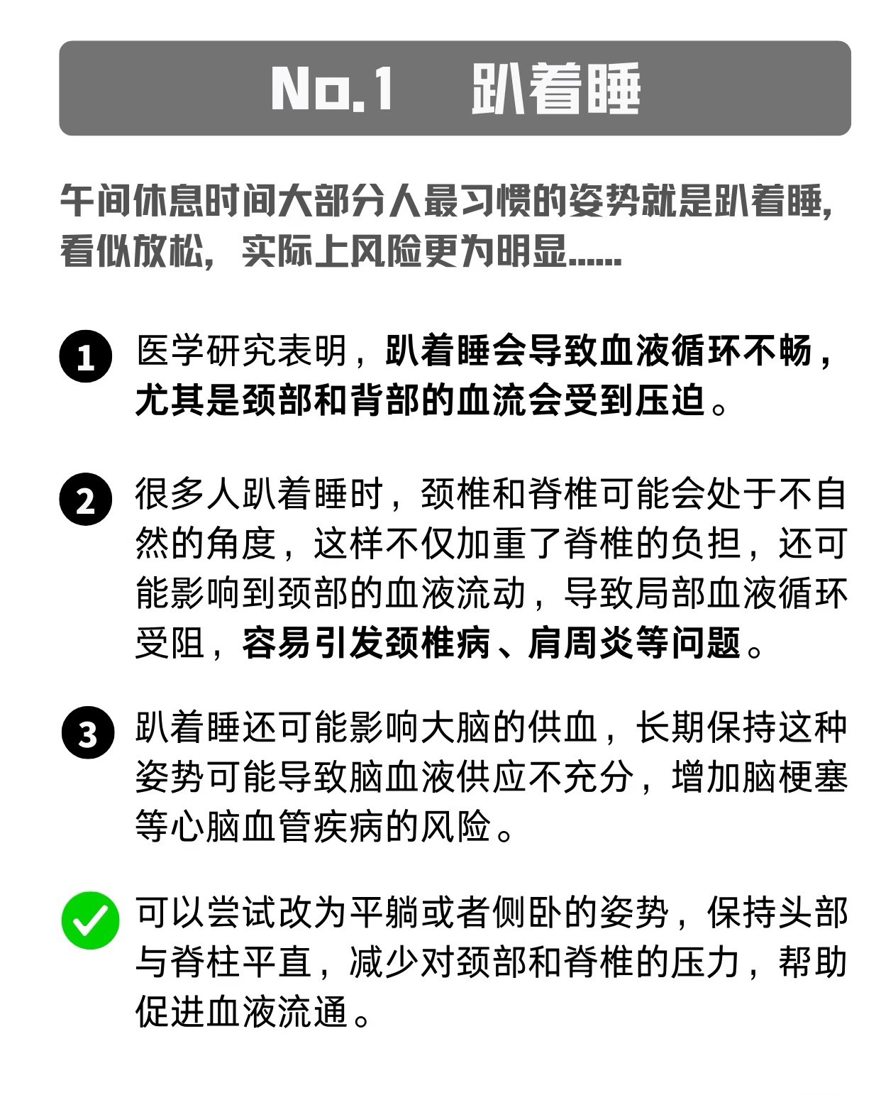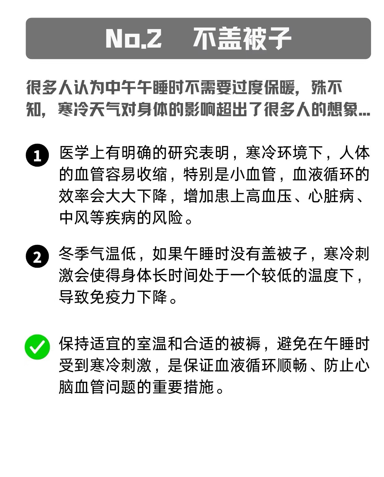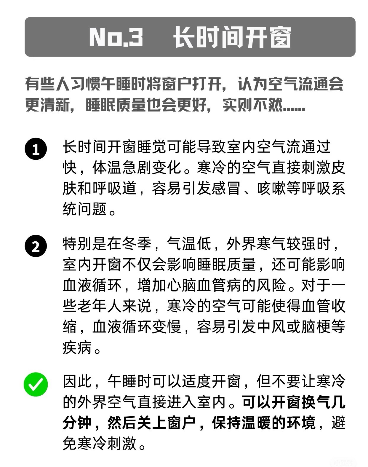 冬天午睡一定要谨慎冬天午睡一定要谨慎 冬季办公室午睡要谨慎别吃太饱再睡!中午吃 7 分饱就行,吃太多油腻、辛辣的食物(比如火锅、炸鸡),午睡时容易腹胀、反酸,影响睡眠质量;别在风口下睡!空调、风扇出风口正下方别坐,就算盖了毛毯,冷风也会钻进衣服里,睡醒容易感冒; 别用手机当枕头!手机有辐射,还会硌到脑袋,睡醒容易头疼,把手机放在桌上,定好闹钟就行冬天在办公室午睡,关键在 “舒服 + 保暖 + 控时”,做好这 5 点,不用回家也能睡个好觉,下午工作效率翻倍,打工人别再硬扛着不午睡啦~