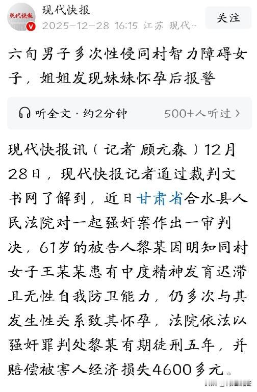 甘肃庆阳,36岁的女子搭乘61岁男子的顺风车,本来是平常的出行,可这男子在途中察觉女子精神不正常、智力低下后,不但没有心生怜悯,反而起了坏心思,动了欺负她的念头。这还不算完,之后这男子更是多次趁女子家里没人的时候,偷偷潜入她家,竟六次与她发生关系,最终导致女子怀孕。直到女子的姐姐发现女子肚子变大,这才赶紧报了警。而法院给出的判决结果,着实让人意外。 (信息来源:现代快报) 去年八月,36岁的王某要回家,就搭了61岁黎某的顺风车。这一路上,两人就聊起来了。黎某这人,心思不正,聊着聊着就发现王某有点不对劲,精神看着不正常,说话做事也透着智力低下的样子。 要是换做正常人,遇到这种情况,肯定会多照顾照顾,可黎某不但没有一点怜悯之心,心里反而起了坏念头,想着要欺负王某。 从那之后,黎某就像被恶魔附身了一样,一直惦记着这事儿。到了2025年,3月18号这天,黎某瞅准机会,趁着王某家里没人,偷偷摸摸地就潜进了王某家。 王某因为精神有问题,根本不知道危险已经降临,对黎某也没有任何防备。黎某看到王某那毫无防备的样子,更加肆无忌惮,强行和王某发生了关系。 有了第一次,黎某就更胆大了。在接下来的日子里,他就像着了魔一样,一次又一次地趁着王某家没人的时候潜进去。 从3月18号到7月28号,短短几个月的时间,他竟然六次潜入王某家,和王某发生关系。 王某因为精神发育迟滞,根本不懂得反抗,也不知道这是对她极大的伤害,只能任由黎某胡来。 时间一天天过去,王某的身体开始出现了变化。到了8月初,王某的姐姐来看她,这一看可把姐姐吓坏了。只见王某的肚子高高隆起,就像怀了孕一样。 姐姐又惊又怒,她怎么也没想到,妹妹竟然遭遇了这样的事情。姐姐赶紧问王某到底是怎么回事,可王某精神不正常,也说不清楚。姐姐心里明白,妹妹肯定是被人欺负了,于是毫不犹豫地报了警。 警方接到报警后,非常重视,立刻展开了调查。通过一系列的侦查工作,很快就锁定了嫌疑人黎某。8月12号,警方迅速出击,将黎某成功抓获。 被抓后的黎某,一开始还想抵赖,可在铁证面前,他不得不承认了自己的罪行。 而此时的王某,因为怀孕时间太长,身体已经受到了很大的伤害,为了她的健康着想,8月13号,王某在医院做了流产手术。 这黎某的行为实在是太恶劣了,他明明知道王某精神不正常、智力低下,没有自我保护的能力,还多次对她进行侵犯,简直就是丧心病狂。 王某本来就已经很不幸了,患有中度精神发育迟滞,生活上就需要别人的照顾和帮助,可黎某却在她最无助的时候,给她带来了更大的伤害。 王某的姐姐看着妹妹遭受这样的痛苦,心里别提多难受了。她一直自责自己没有早点发现妹妹的异常,没有保护好妹妹。 她希望法律能够严惩黎某,让妹妹得到应有的公道。周围的人知道这件事后,也都对黎某的行为感到愤怒,纷纷指责他不是人,连一个精神有问题的人都欺负。 王某虽然不懂发生了什么,但能感觉到自己身体的不舒服,常常一个人坐在那里发呆。姐姐看在眼里,疼在心里,只能尽量多陪陪她,给她一些安慰。 根据《刑法》第二百三十六条规定,以暴力、胁迫或者其他手段强奸妇女的,处三年以上十年以下有期徒刑。奸淫不满十四周岁的幼女的,以强奸论,从重处罚。强奸妇女、奸淫幼女,有下列情形之一的,处十年以上有期徒刑、无期徒刑或者死刑:(一)强奸妇女、奸淫幼女情节恶劣的;(二)强奸妇女、奸淫幼女多人的;(三)在公共场所当众强奸妇女、奸淫幼女的;(四)二人以上轮奸的;(五)奸淫不满十周岁的幼女或者造成幼女伤害的;(六)致使被害人重伤、死亡或者造成其他严重后果的。 黎某明知王某有中度精神发育迟滞,无性防卫能力,这和奸淫幼女在本质上没啥区别,都属于被害人没有自我保护能力的情况。 他还多次对王某进行侵犯,这情节那是相当恶劣。虽然他有坦白、认罪认罚的情节,但这并不能减轻他罪行的严重性。 最终法院认为,黎某明知王某有中度精神发育迟滞,无性防卫能力,还多次对她进行侵犯,其行为已经构成了强奸罪。 而且他的行为还导致王某流产,给王某的身体和经济都造成了损失,应该进行赔偿。 虽然黎某有坦白、认罪认罚的情节,但他的罪行实在太严重,不可饶恕。 最终,法院以强奸罪判处黎某有期徒刑五年,同时赔偿王某4600多元。