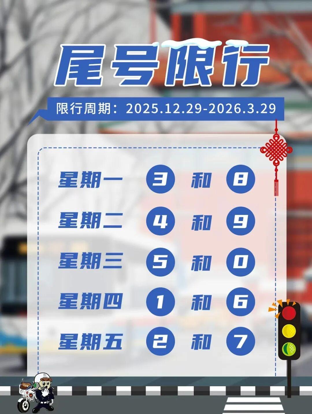 重要提醒!天津车主注意,明天(12月29日)又要开启新一轮汽车尾号轮换,星期一至星期五限行机动车车牌尾号分别为:3和8、4和9、5和0、1和6、2和7。另外,从明天开始,气温将进入下降通道,温度一路走低,注意防寒保暖。天津 天津百姓身边事 明天开始汽车尾号轮换