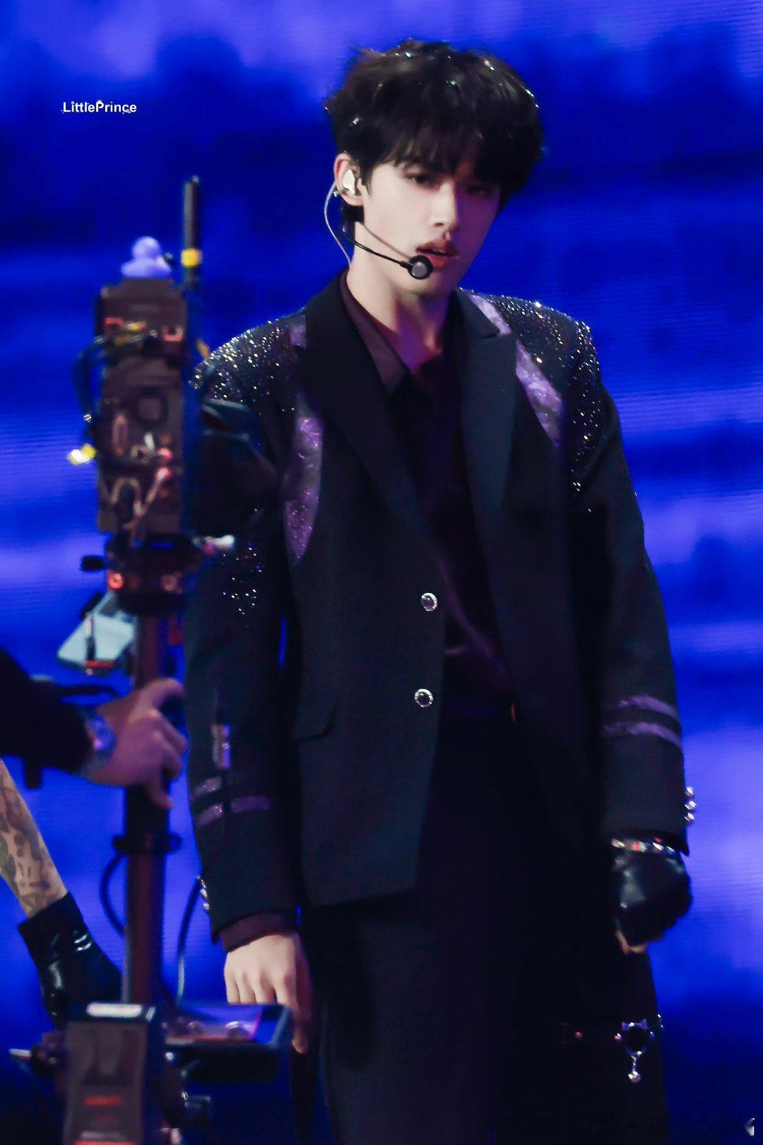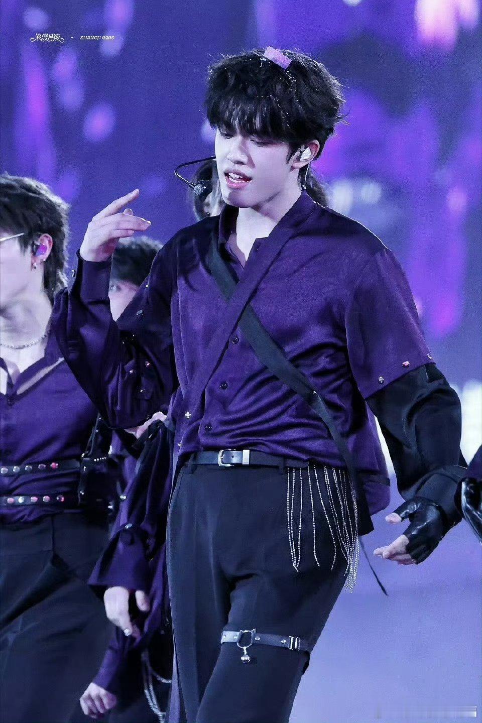 张极紫色衬衫配腿环谁家小王子舞台玩这么大啊!紫色魅惑感溢出屏幕,腿环设计又飒又带感。这造型师必须加鸡腿!