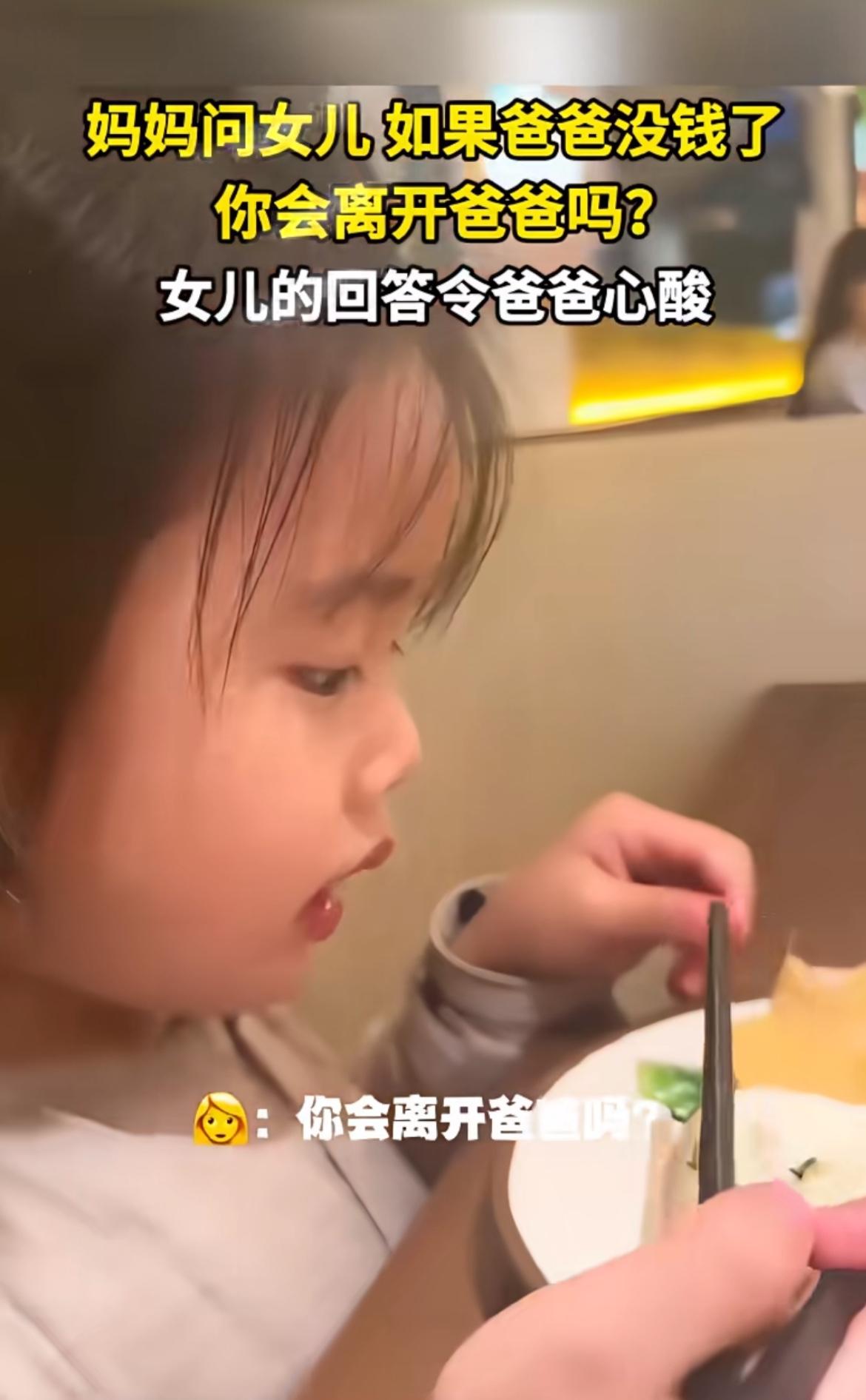 刷到一个视频,妈妈问女儿:“爸爸要是有一天没钱了,你会不会离开爸爸?”女儿小脑袋一歪,脆生生地回答:“我才不要离开爸爸。”爸爸正感动着呢,女儿又接着说:“爸爸要是没钱了,我就去给爸爸找好多好多有钱的叔叔阿姨,让他们给爸爸钱,爸爸就有钱啦!”爸爸这心酸得呀,本来还期待女儿说不离不弃啥的,结果女儿这脑回路太清奇。小孩子的想法就是天真烂漫,在她心里只要想办法就能解决爸爸没钱的问题,根本想不到离开这回事,这反差萌真让人又想笑又心疼爸爸那一瞬间的小失落。