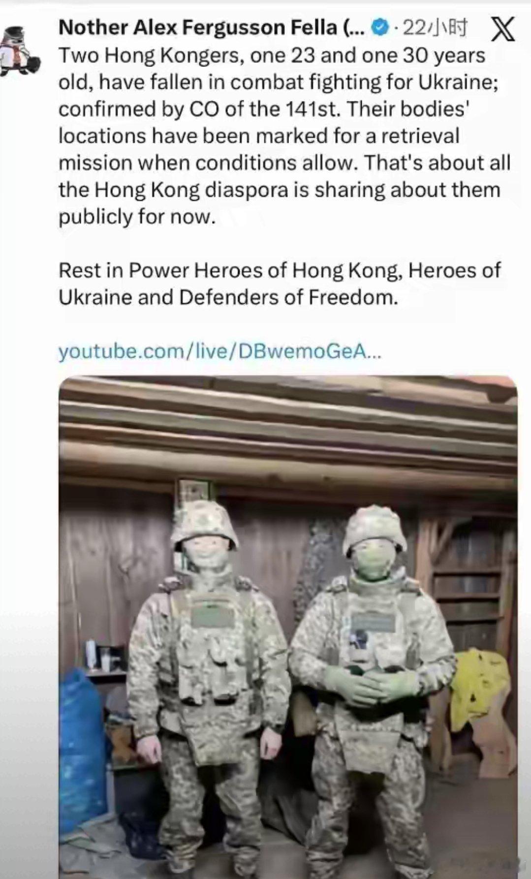 香港籍雇佣兵加入乌克兰军队一个月遇袭阵亡。蚌。俄乌冲突开始后,几个月内西方编织的所谓乌军赢麻,还勉强能唬到人。现在居然还有人信。那只能说这种人为自己的认知付出代价