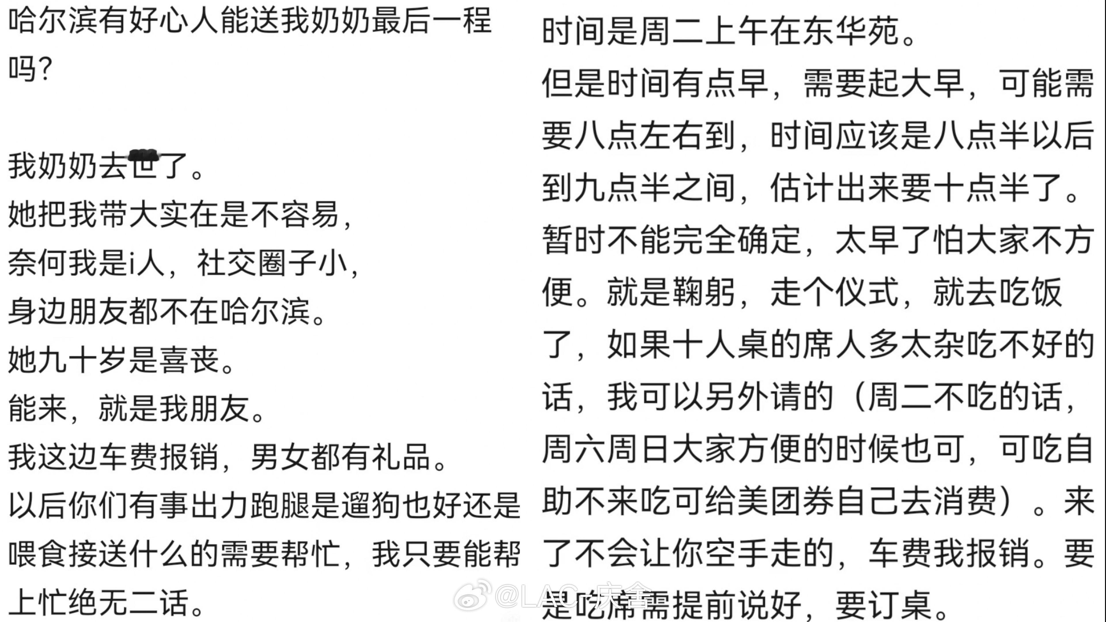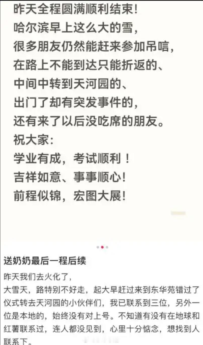 奶奶喜丧女子因朋友少求助网友漫天飞雪中,数十位陌生人因一则求助奔赴葬礼。他们用“说到做到”的承诺,温暖了一个陌生人的告别仪式。也让一场原本可能冷清的送别,变成了人间善意最滚烫的证明。