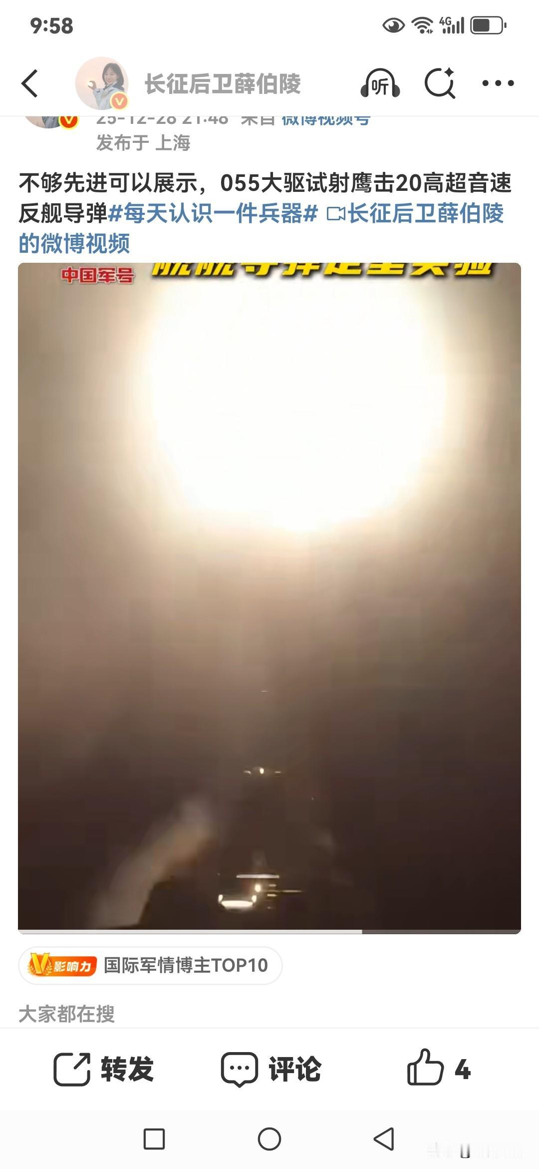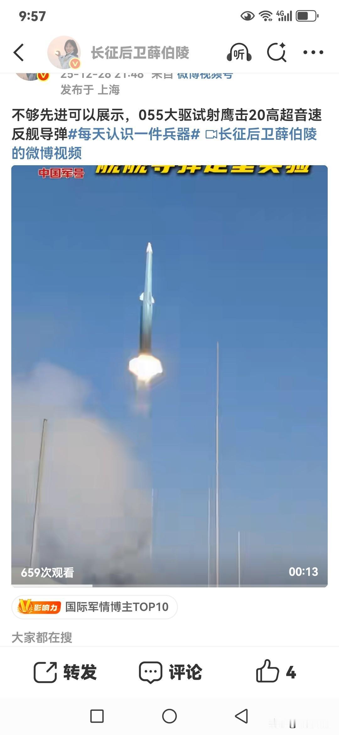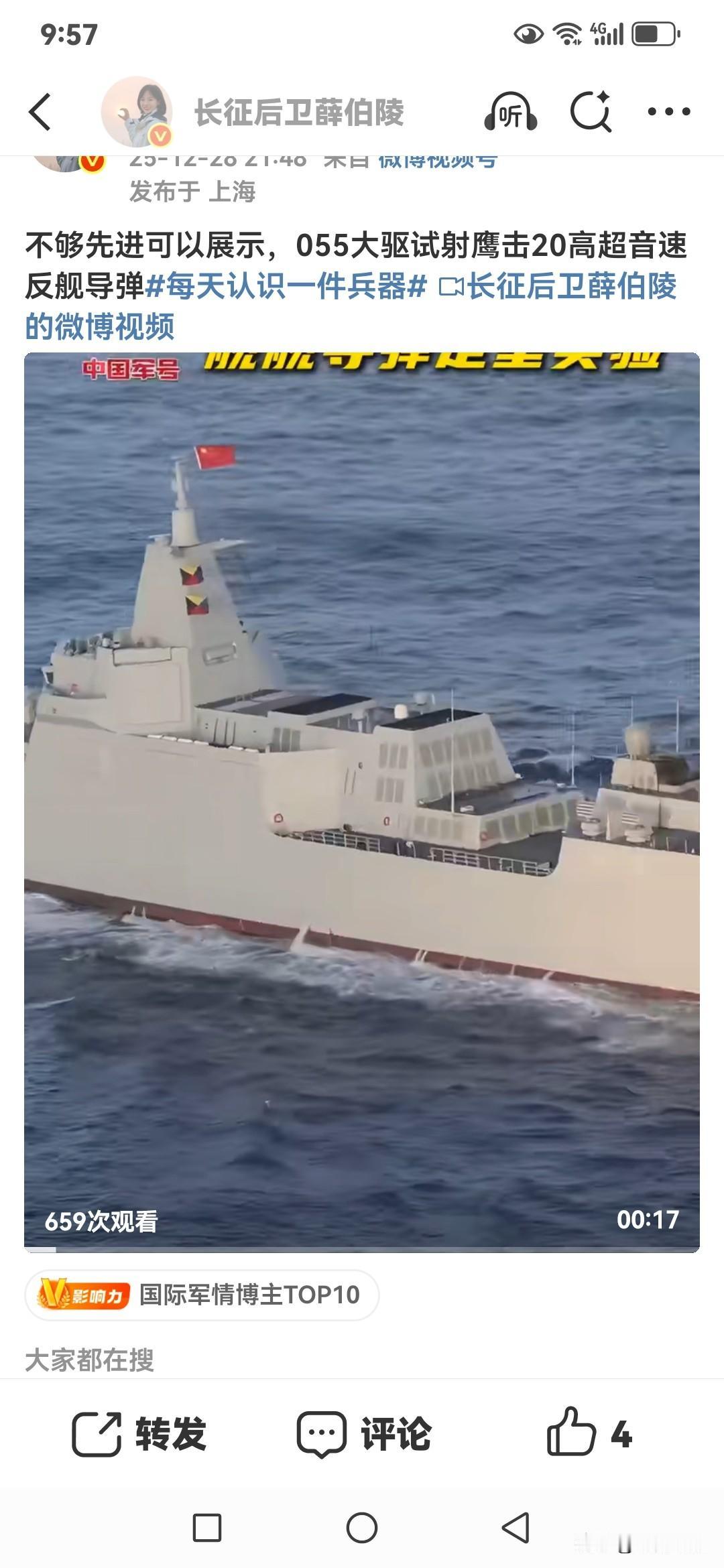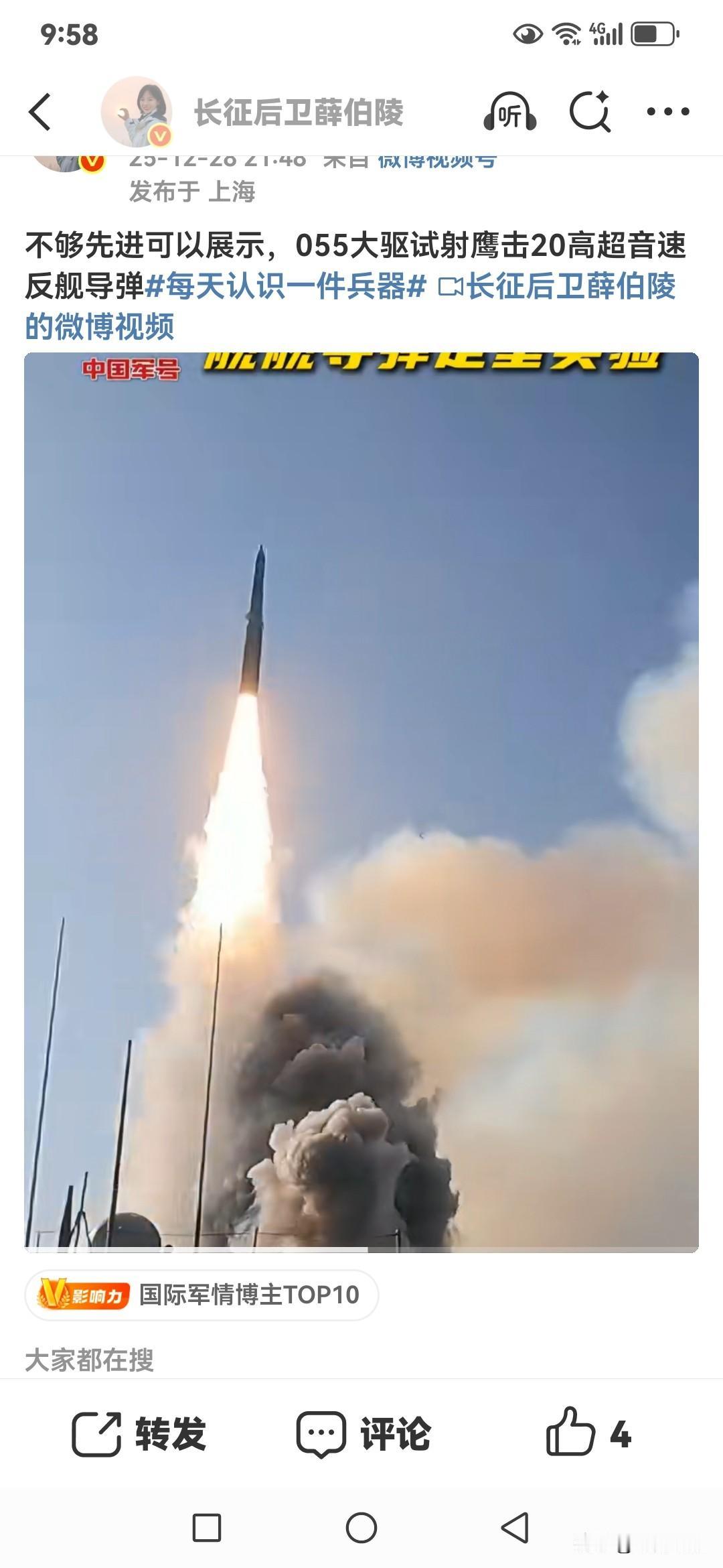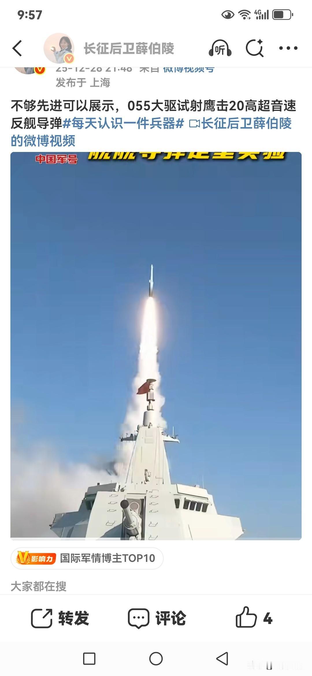 12月28日有大消息!《中国军号》发布055型驱逐舰无锡舰发射大型导弹画面,这次是舰舰导弹定型试验。视频完整展示导弹从垂发系统窜出、点火升空,画面超清晰。 外界猜测这枚导弹可能是鹰击 - 20。此前阅兵展示过它,如今装备到军舰,意味着它能投入使用。它最小射程达1500公里,远超美航母舰载机作战半径,美航母还未靠近作战区域就已进入危险范围。全球能装备军舰的高超音速导弹里,鹰击 - 20是唯一公开服役的型号。咱055大驱有一百多个发射单元,多种任务都能兼顾,太牛啦! 反舰导弹 反舰弹道导弹 反舰巡航导弹 鹰击-21导弹 反舰导弹演练 军舰导弹 鹰击-19导弹