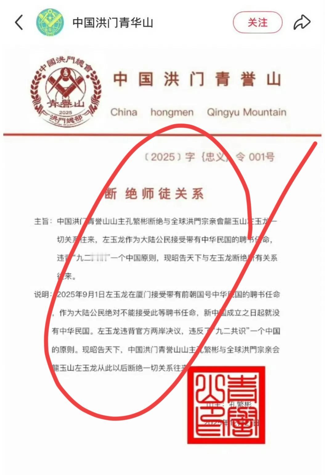 看到网上真有发洪门那个断绝关系的公告,还以为都是老黄历了。现在都2025年了,居然还有这种事。还是发生在厦门那边,看着还挺真。 洪门倪伟跟左玉龙本来是师徒,结果9月27号直接宣布脱关系。原因说是左玉龙收了个带着民国国号和国旗的聘书,倪伟觉得这不行,违背一个中国。所以提前“跑路”了。后面左玉龙反手就说开除他,还搞网上炒作。 更乱的是,有个叫青华山聚宝堂的,又说早就退出倪伟的假洪门,说他收徒骗钱。整个一连环套。什么洪门、青帮的头衔,听着唬人,但看这些撕逼,感觉好多都是贴金的,真假难分。 现在这情况,一边喊着爱国反台独,一边自己内部斗得跟狗一样。什么革命之母,海外正统,看到这出戏,也真说不清了。