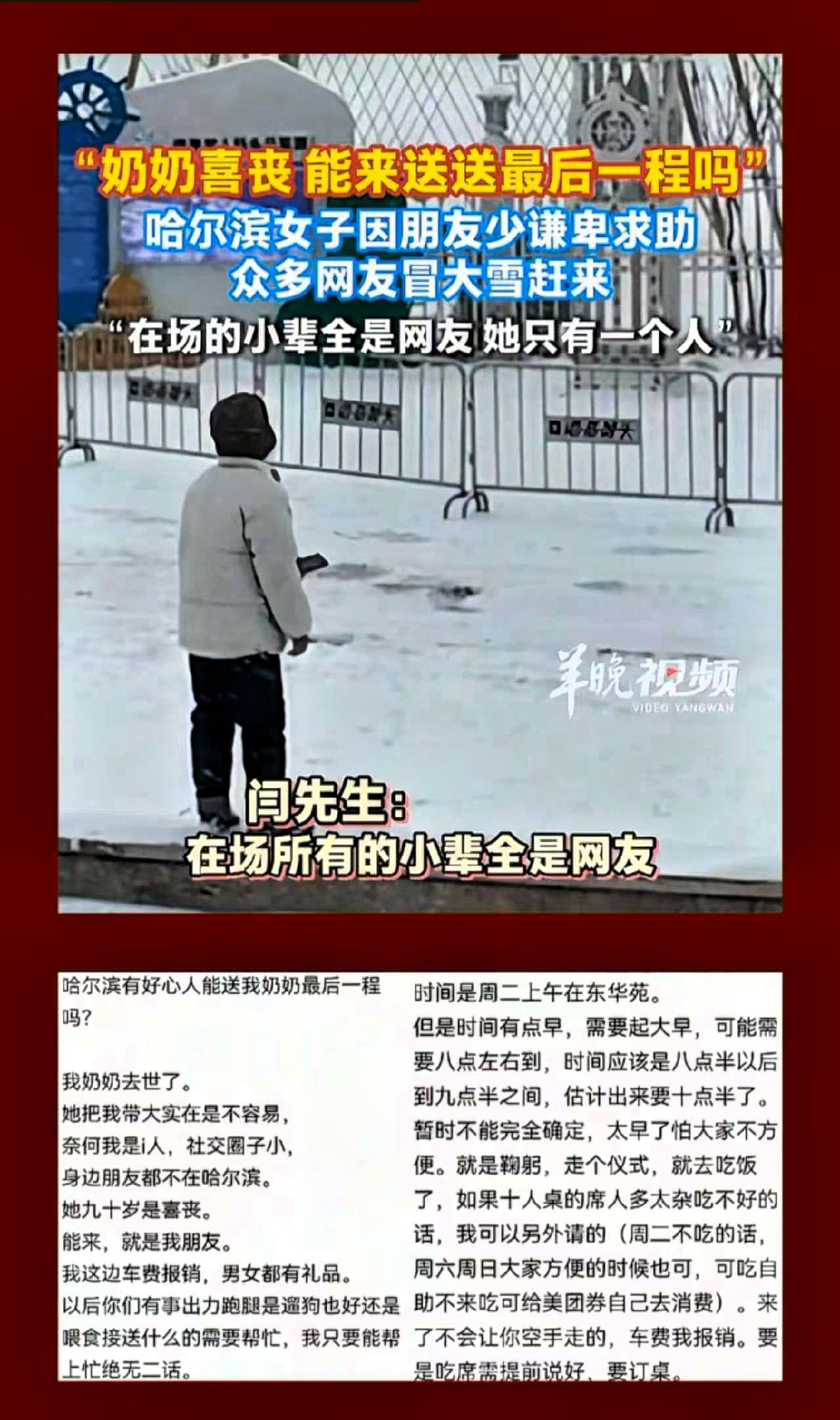 破防了!哈尔滨,女子90岁的奶奶高寿喜丧,结果自己社交圈窄、本地没有亲友,连送奶奶最后一程的人都凑不齐 既怕打扰别人,又怕老人走得孤单,鼓起勇气网上发帖求助,本以为会石沉大海,结果收获了满屏善意。 帖子发出去没多久,数千条暖心回应就涌了进来,有人留言要来帮忙,有人分享葬礼礼仪,远在外地的网友甚至想转账代买花圈,大家的善意实实在在地扑面而来。 更让人动容的是葬礼当天,哈尔滨突降暴雪,道路积雪没膝,交通近乎瘫痪,原本18分钟的路要走40多分钟,可素不相识的网友们愣是没有一个爽约。 加班到凌晨3点的闫先生,心疼姑娘的无助,当即私信承诺一定到,怕起晚错过约定,他索性整夜没合眼,凌晨5点裹上厚衣服,踩着积雪往殡仪馆赶; 浙江小情侣原本在五常旅游,看到帖子后立刻调整行程,提前一天赶到哈尔滨,特意订了离殡仪馆最近的酒店,葬礼当天打车无果、公交走走停停,赶到殡仪馆时才得知老人已送往十公里外的火化场,他俩没放弃,和一名游客、一名女大学生结伴追赶,最终在火化场陪老人走完最后一程 还有人半路被困三小时,在离殡仪馆几公里处下车徒步前行,即便最终没赶上,也在社交平台留言:“想让你知道,我们都来过”。 三四十个陌生人聚在一块儿,默契得像家人,鞠躬默哀全程安静有序,一句“我们不认识奶奶,但知道她不该一个人走”,让在场的人红了眼眶。姑娘事后悄悄给没能好好招待的游客送用餐券,网友感慨“极寒之地的人心,暖得发烫”。 总有人说现在人情淡了,可这场暴雪里的奔赴,就是最有力的反驳。善意从来不分熟不熟,承诺也从不是随口说说,东北人的“说到做到”,在零下几十度的寒风里,暖透了整座城,也暖到了无数人心里。