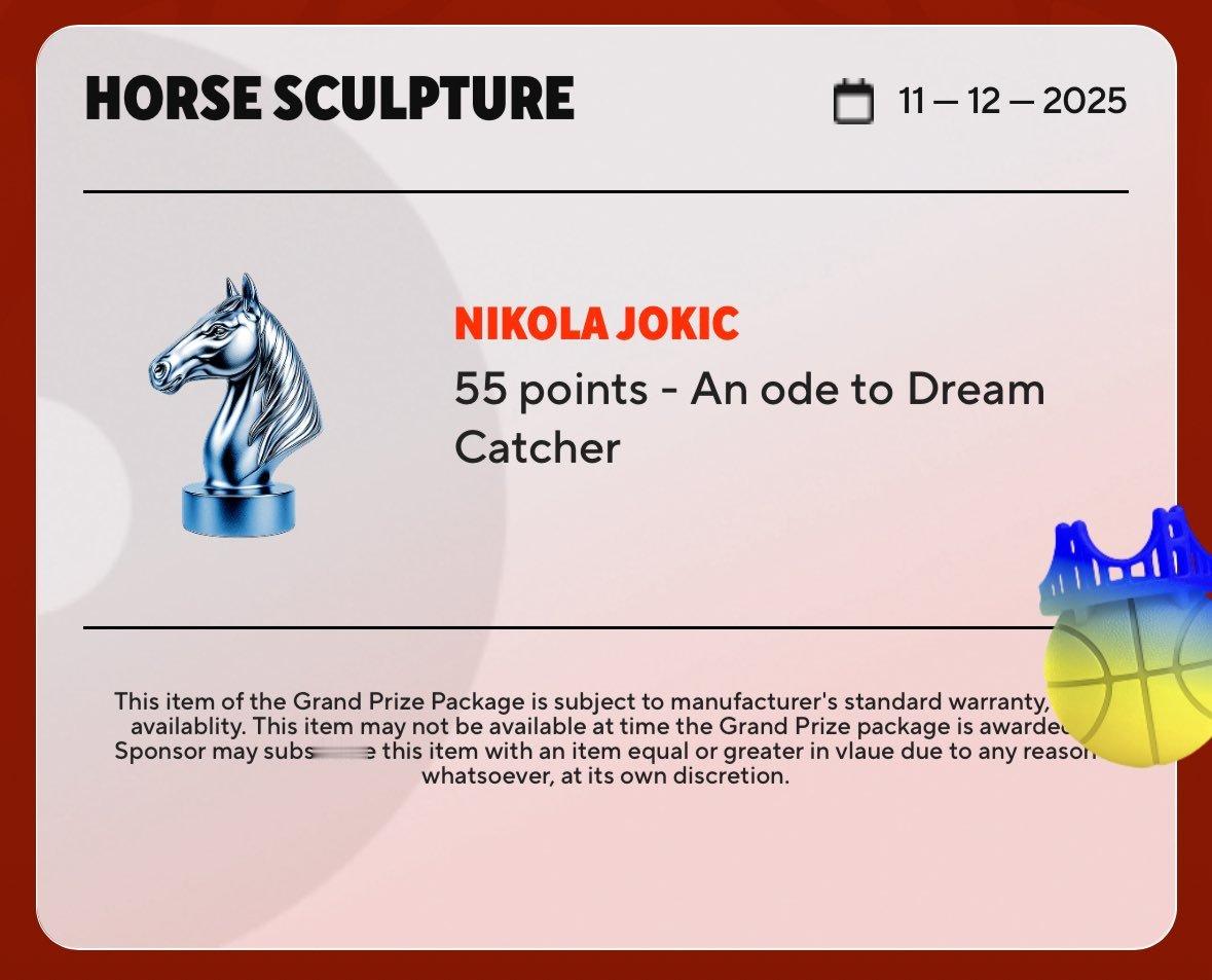 约基奇本赛季在整个 NBA领跑以下数据: • 单场最高得分 • 50+ 得分场次最多 • 三双次数 • 真实命中率 • 球员效率值(PER)本赛季每当有人砍下 50 分,DoorDash 都会为一位幸运球迷的「The Bag」里加一件奖品。上一次约基奇拿到 50+,DoorDash 直接往里加了一个马的雕塑 😂