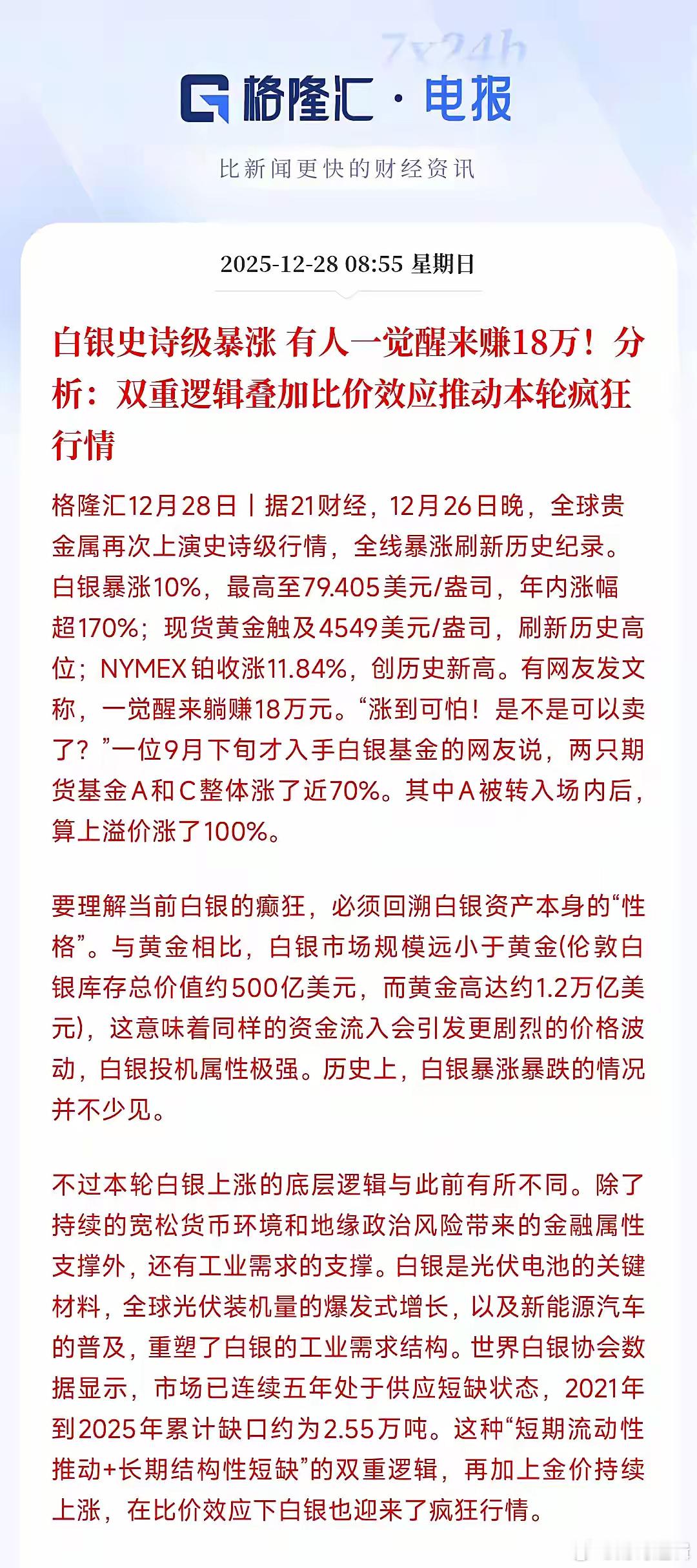 白银才是贵金属最赚钱的,黄金都得靠边站现在的白银可谓是期货市场最靓的仔,周五直接暴涨10.24%,在期货市场已经溢价率开始出现100%的情况。而且白银有一个特性比黄金还要金贵,就是各国的储量比黄金要少很多,伦敦现货白银的库存只有500亿美元的储量,也就是现在的白银的储量远远低于需求量,这就造成了白银持续上涨。而且白银在工业上的用途还在持续增加,光伏,新能源车上面都会大量用到白银,这再次加剧了白银价格的上涨。随着白银的上涨,投资者大量涌入导致期货市场疯狂的涨价,目前白银期货的购买单数已经开始限制,就是怕出现系统性风险