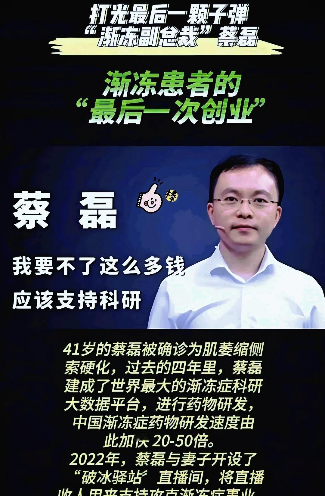 真替段睿松口气, 夫妻俩的苦日子总算熬出头! 蔡磊太牛了, 确诊渐冻症6年砸超一亿, 曾因段睿直播筹经费遭非议, 如今部分基因型渐冻症被攻克, 20多岁女患者用药后恢复正常生活, 这不仅为他自己挣来时间, 更给国药界长了脸。 愿上天多眷顾蔡磊, 别让段睿再那么辛苦。