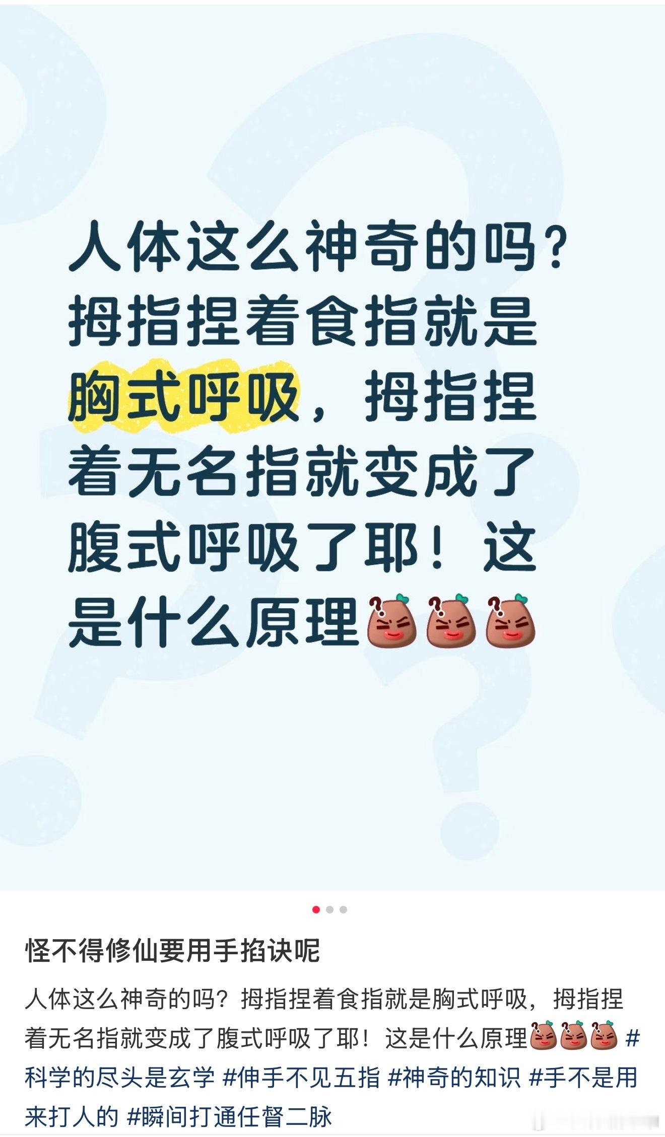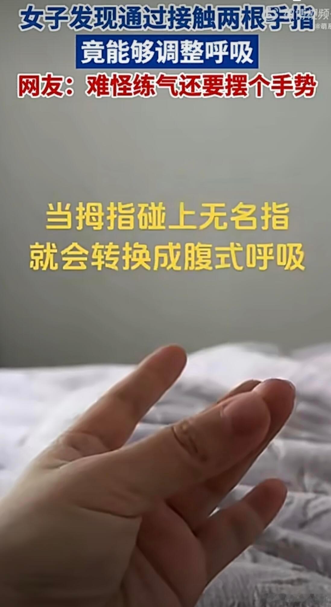 人体这么神奇的吗?拇指捏着食指就是胸式呼吸拇指捏着无名指就变成了腹式呼吸了我试了试是真的…心理作用吗…什么原理