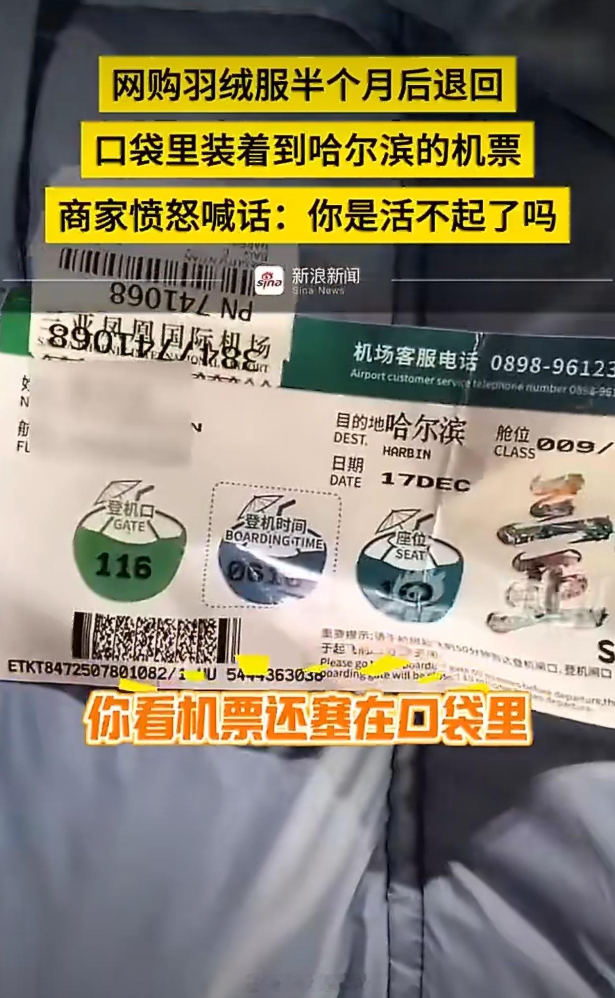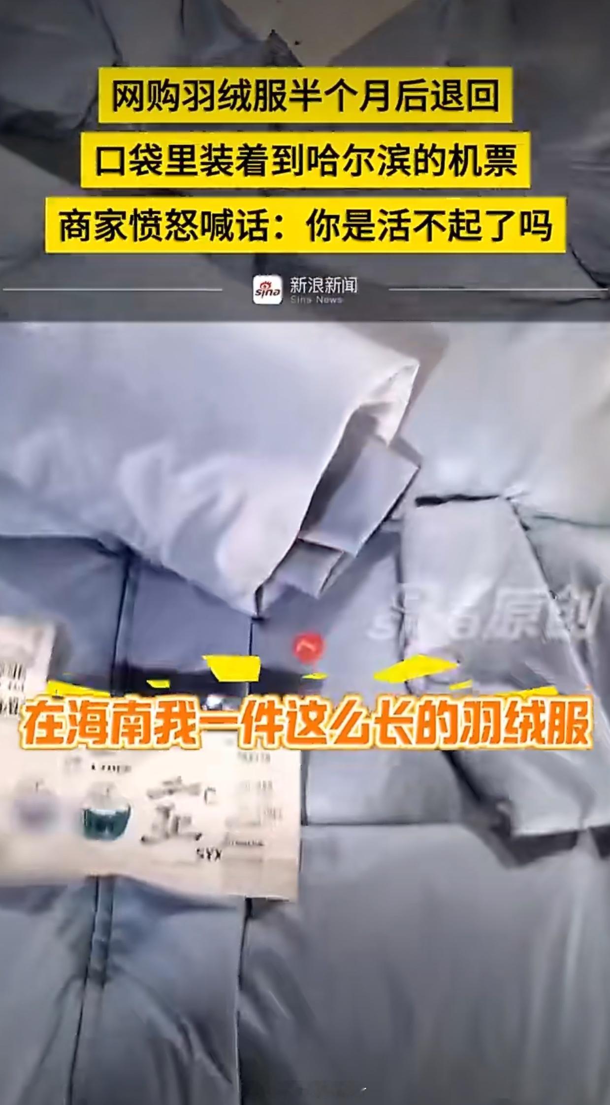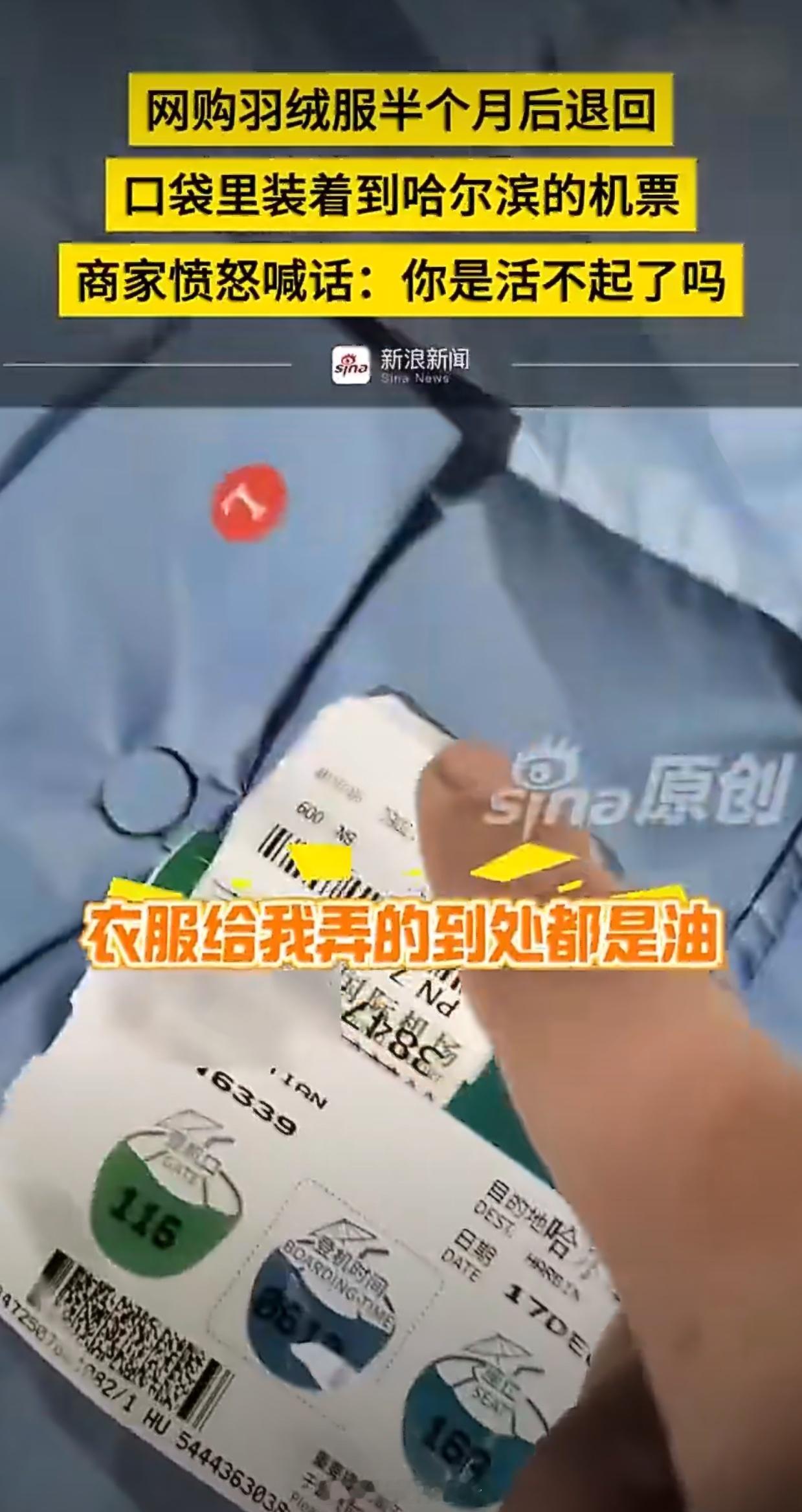 网购羽绒服半个月退回口袋装着机票她都仅退款了,还要什么脸?对付这套号的人就不能惯着后台都能查出来信息啥的直接永久禁止网购除非换身份证不然她们没人长记性的