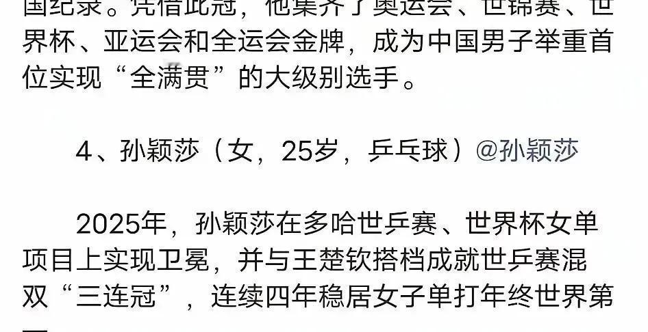 巴黎倒计时30天,孙颖莎被官方点名! 新华社刚发十佳运动员名单,她排第一。原因简单:去年拿完世界杯、世锦赛、混双三连冠,世界第一坐了180周,法国总统都记得她小名。 有人觉得这只是个荣誉,我翻完总局文件发现不一样。名单里专门加一句“拒绝饭圈化”,等于给所有运动员立规矩:成绩必须配得上流量。孙颖莎的代言现在全是国家队合作款,连拍广告都穿训练服,团队怕她跑偏。 最狠的是备战细节。央视跟拍透露,她每天加练反手到凌晨,陪练是男队削球手。教练组算过,她外战胜率98%,但奥运要的是100%。 巴黎如果女单夺冠,她就成了继邓亚萍、张怡宁后第三人。到时候不止多一块金牌,体育总局的“训练标兵”称号才算真正落地。现在每个动作都被放大解读,连赛前剪头发都要报备。 这份名单其实是封战书:想红可以,先拿成绩砸开大门。