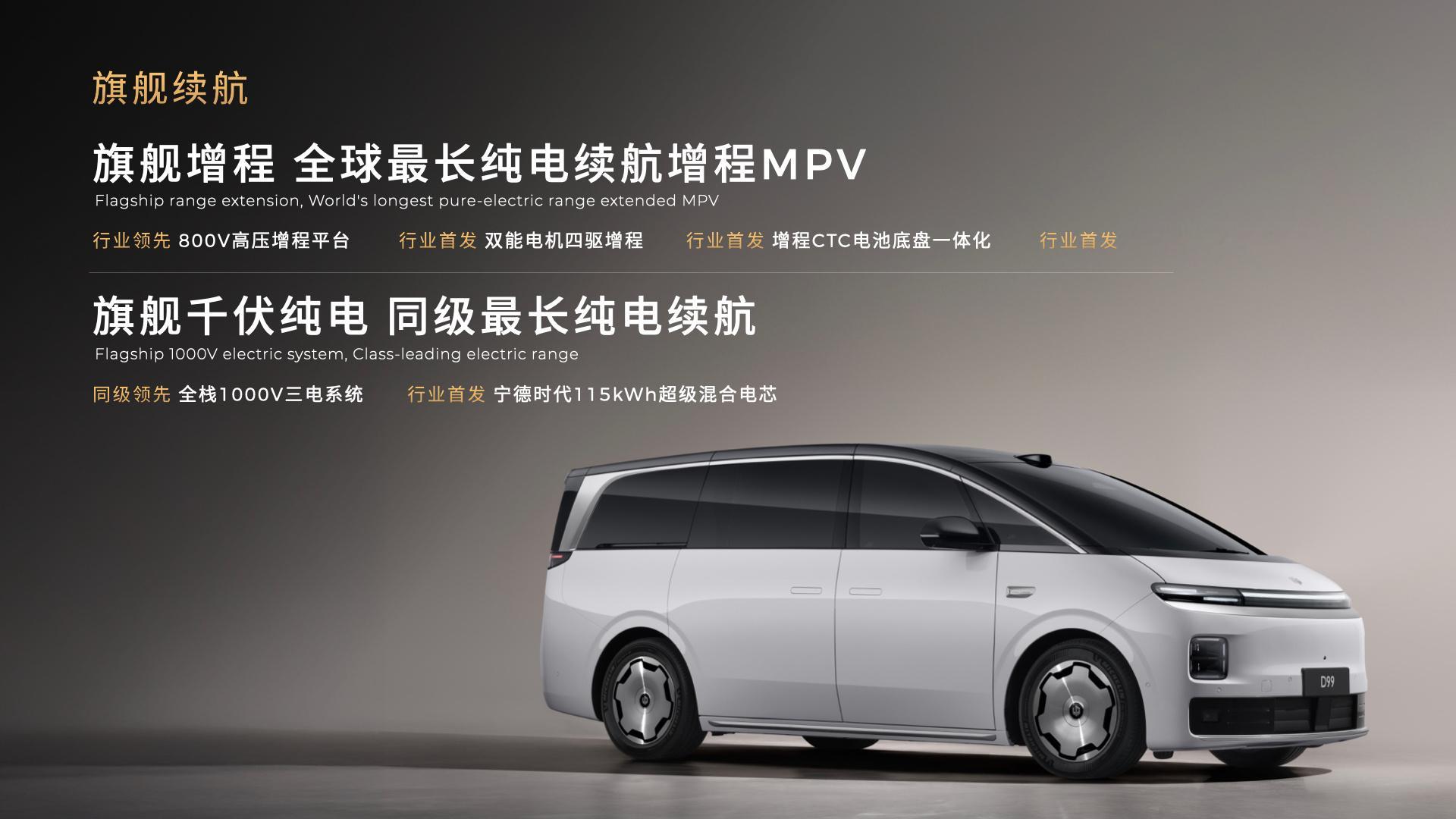 零跑汽车十周年零跑9系豪华双旗舰同台首秀 要说最能代表零跑阶段性成长的,其实还要看零跑的第一辆MPV车型,零跑D99。这是紧跟用户成长脚步的作品。在此之前,零跑完成了ABCD四大系列以及Lafa5的产品布局,形成包含轿车、SUV、MPV在内的多元化产品阵容,实现了从A0级到D级全维度覆盖,更提供纯电和增程双动力选择。热销的B系列、C系列更多是面向年轻家庭、主流家庭用户,当他们的人生迈入新阶段,事业有成,家庭美满,所需要的车也要空间更大、满足更多使用场景,因此D99的定位是科技豪华旗舰MPV,覆盖家庭出行和商务接待。新车提供增程与纯电双动力选择:增程版搭载80.3kWh大电池与800V高压平台,实现超长纯电续航;纯电版配备115kWh大电池与全栈1000V高压平台,性能与效率全面领先。设计与配置都是走高质感、高价值路线,相信有D平台的百万级技术赋能,D99会带来很多惊喜,满足用户的需求变化。